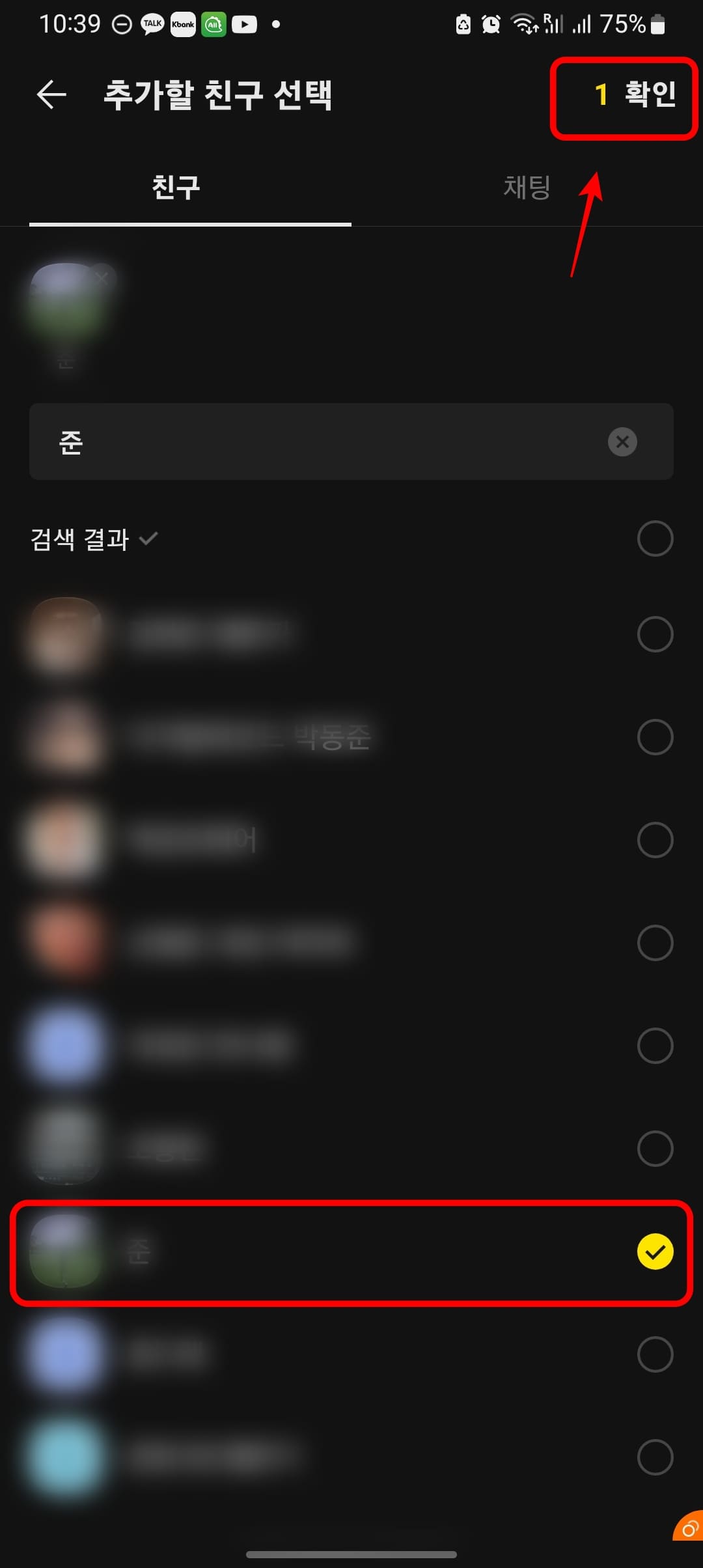 프로필 친구 관리 메뉴에서 지정친구 추가 버튼을 터치합니다. 자신과 연결된 친구 목록에서 멀티프로필을 보여줄 친구를 선택하고 우측 상단의 확인 버튼을 터치합니다.