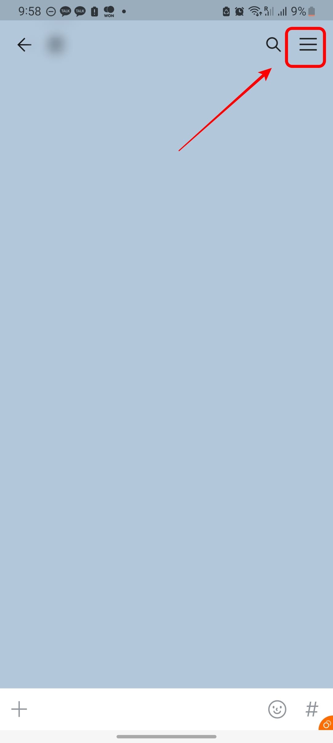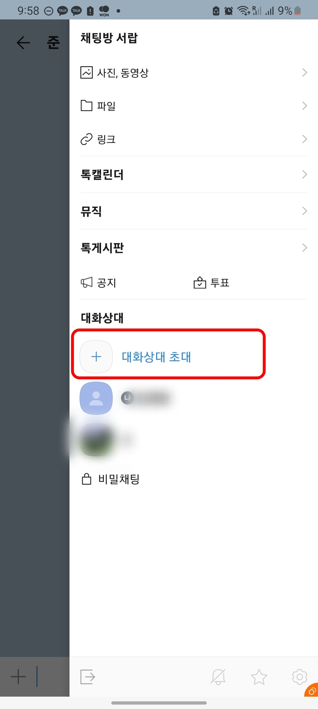 친구와 1:1 채팅을 하다가 필요에 의해 다른 인원을 추가로 초대하게 되면 1:1 채팅방이 단톡방으로 전환되게 됩니다. 먼저 1:1 채팅방에 입장한 후 우측 상단의 3선 아이콘을 터치합니다. 채팅방 서랍 메뉴가 표시되면 하단에서 대화상대 초대 메뉴를 터치합니다.