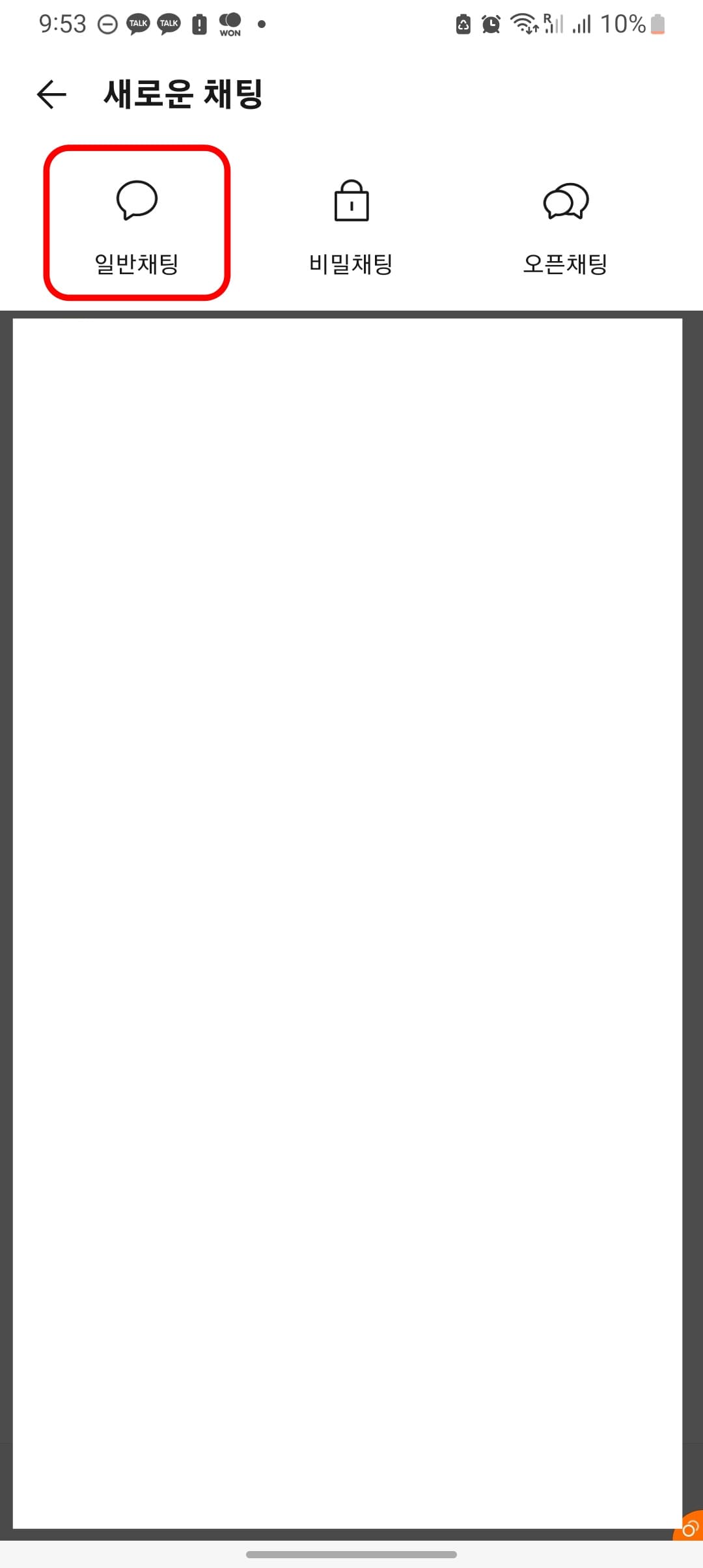 카톡 어플을 실행하면 먼저 하단의 채팅 메뉴를 클릭합니다. 이후 우측 상단에 있는 채팅방 만들기 아이콘을 클릭합니다. 새로운 채팅 메뉴가 표시되면 일반채팅, 비밀채팅, 오픈채팅 중 일반채팅을 터치합니다.