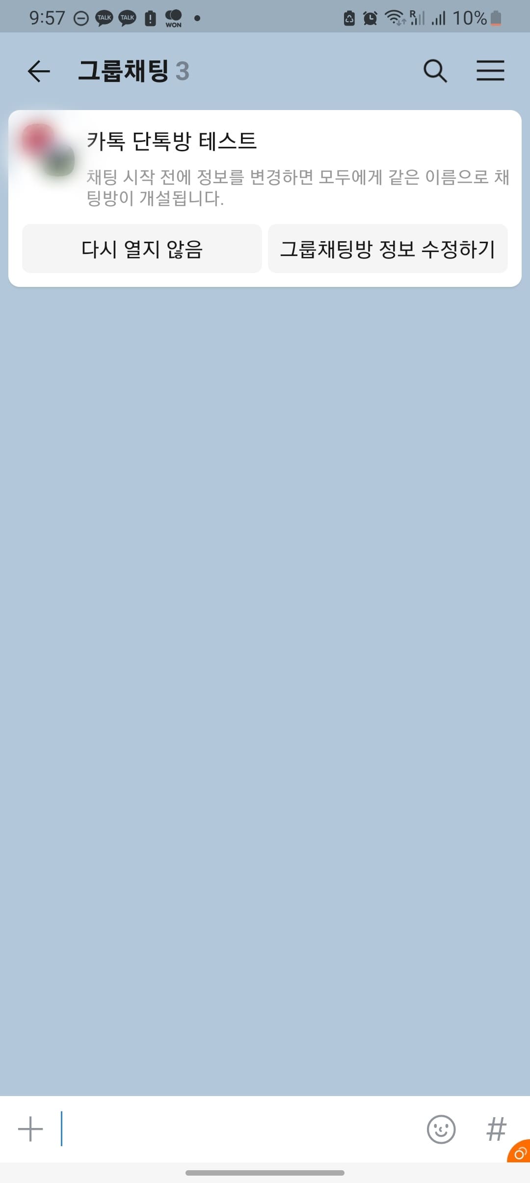 3명의 인원이 채팅 할 수 있는 그룹채팅 방이 생성되었습니다. 이 채팅방을 활성화시키려면 아무 메시지 또는 이모티콘을 입력합니다. 만약 아무 메시지도 입력하지 않고 채팅방을 나가게 되면 단톡방은 자동으로 종료됩니다.