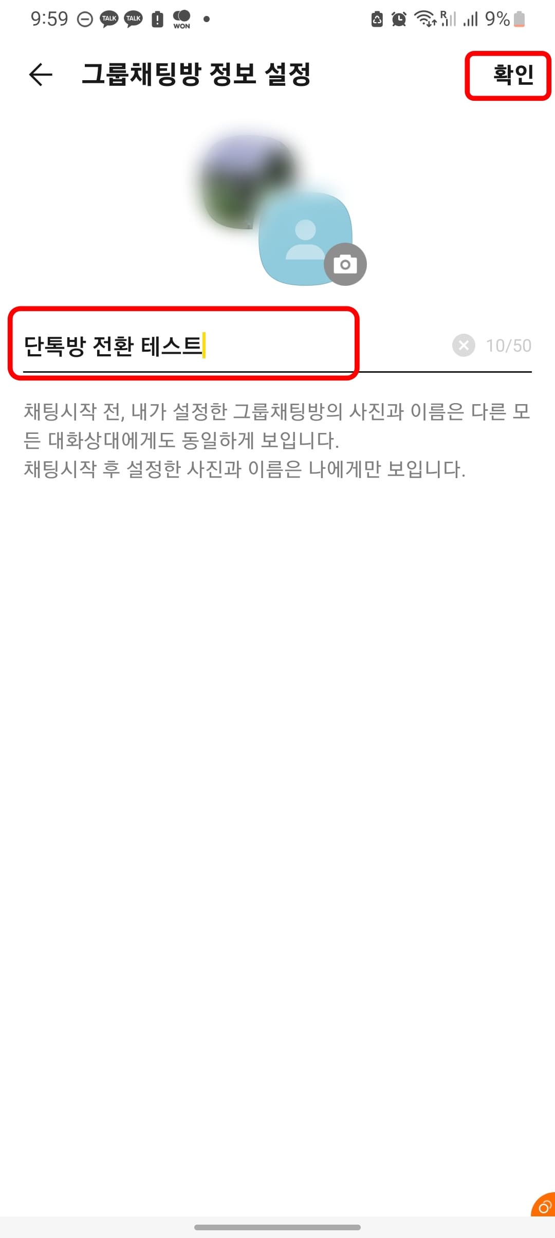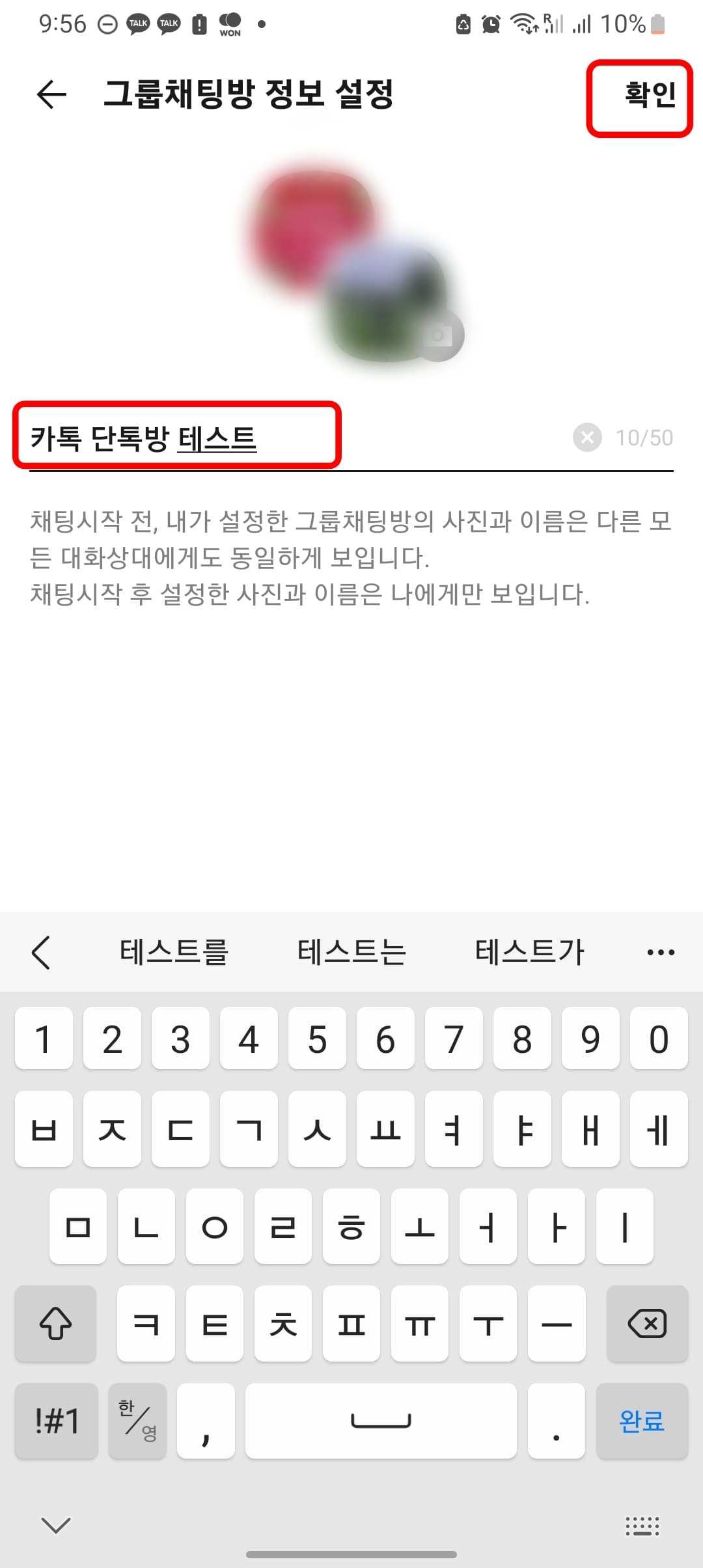 그룹채팅방 정보 설정 메뉴가 표시되면 단톡방 이름을 50자 이내로 설정하시기 바랍니다. 여기에서는 ‘카톡 단톡방 테스트’라고 입력해 보았습니다. 입력 후 우측 상단에서 확인 버튼을 터치합니다.