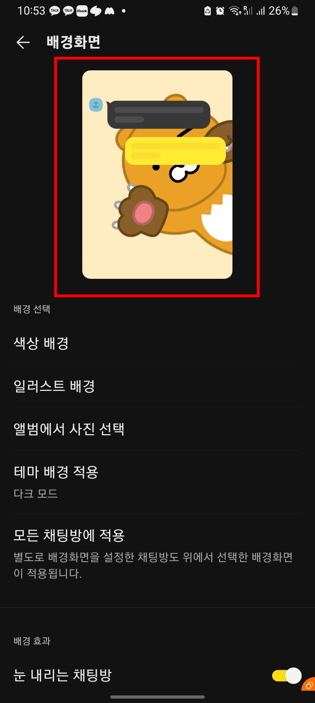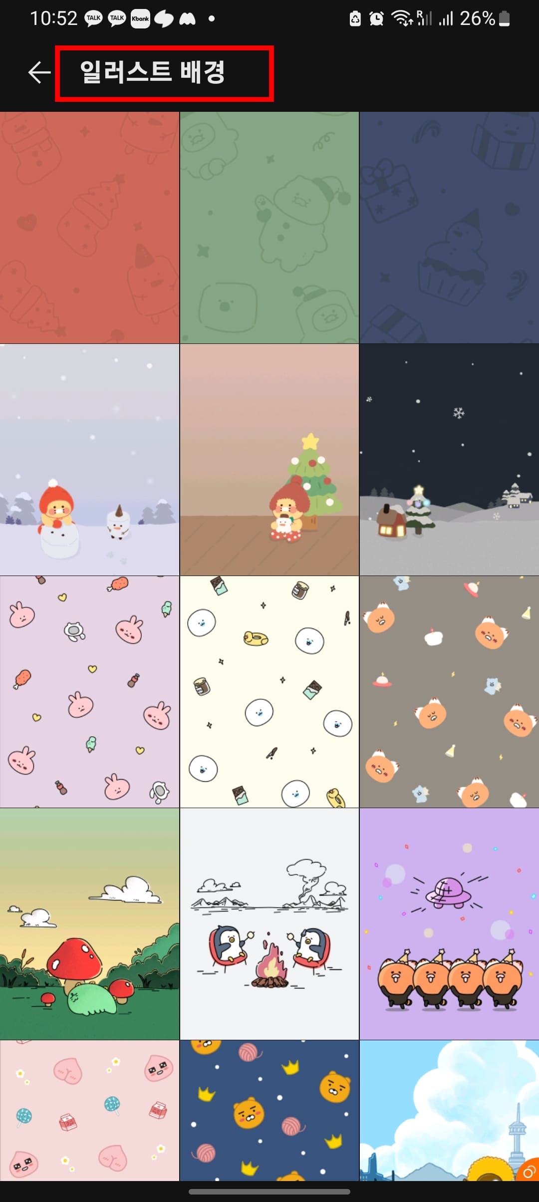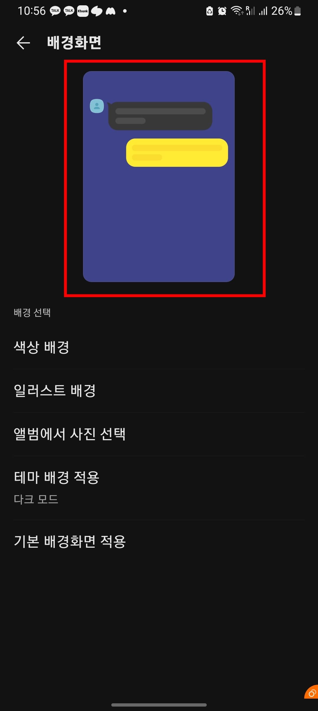 여기에서는 일러스트 배경을 선택해 보았습니다. 위의 사진처럼 미리 보기 이미지를 확인할 수 있습니다. 채팅방에 들어가 보면 일러스트 배경이 적용된 것을 확인할 수 있습니다.