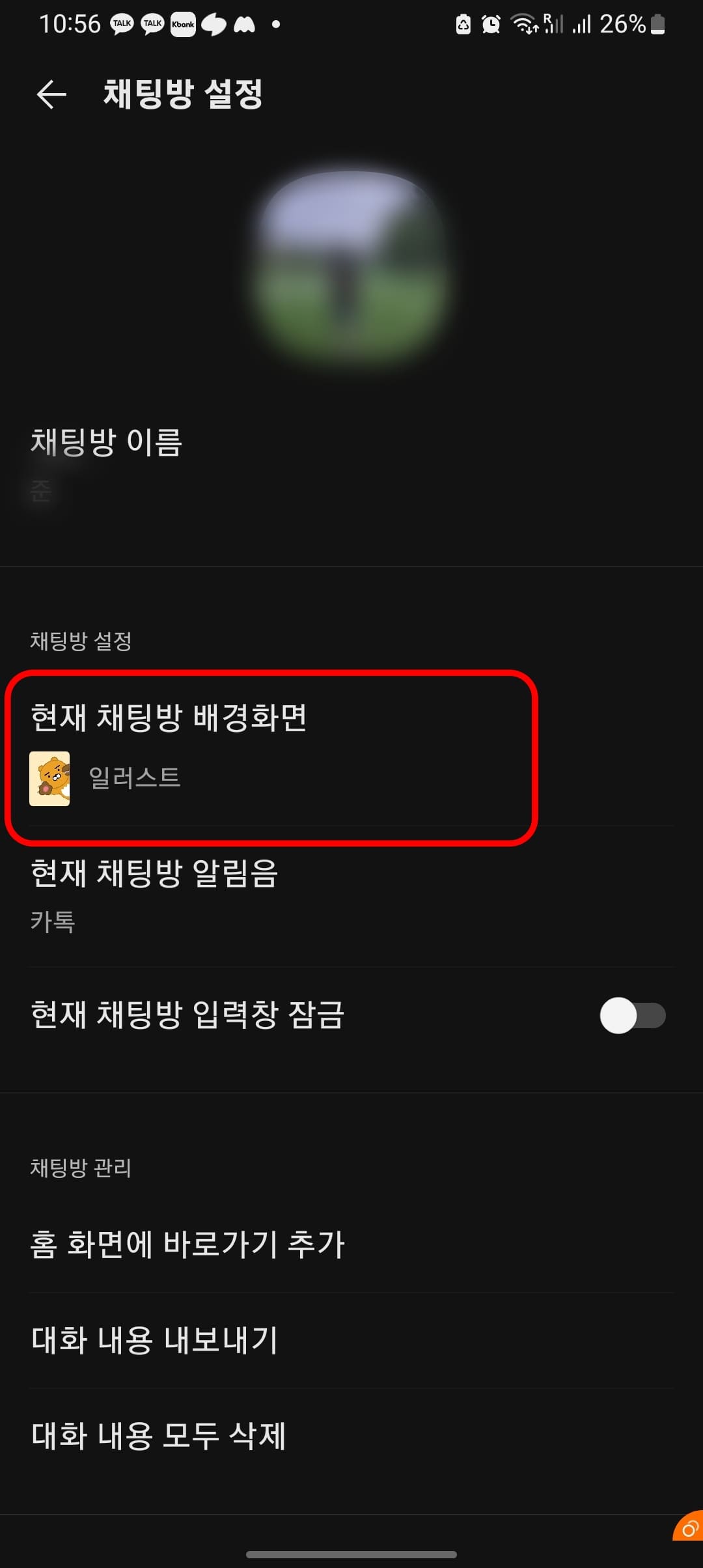먼저 배경화면 변경을 원하는 채팅방에 입장합니다. 우측 상단 3선 아이콘을 터치합니다. 채팅방 설정 메뉴 하단에 현재 채팅방 배경화면 메뉴를 터치합니다.