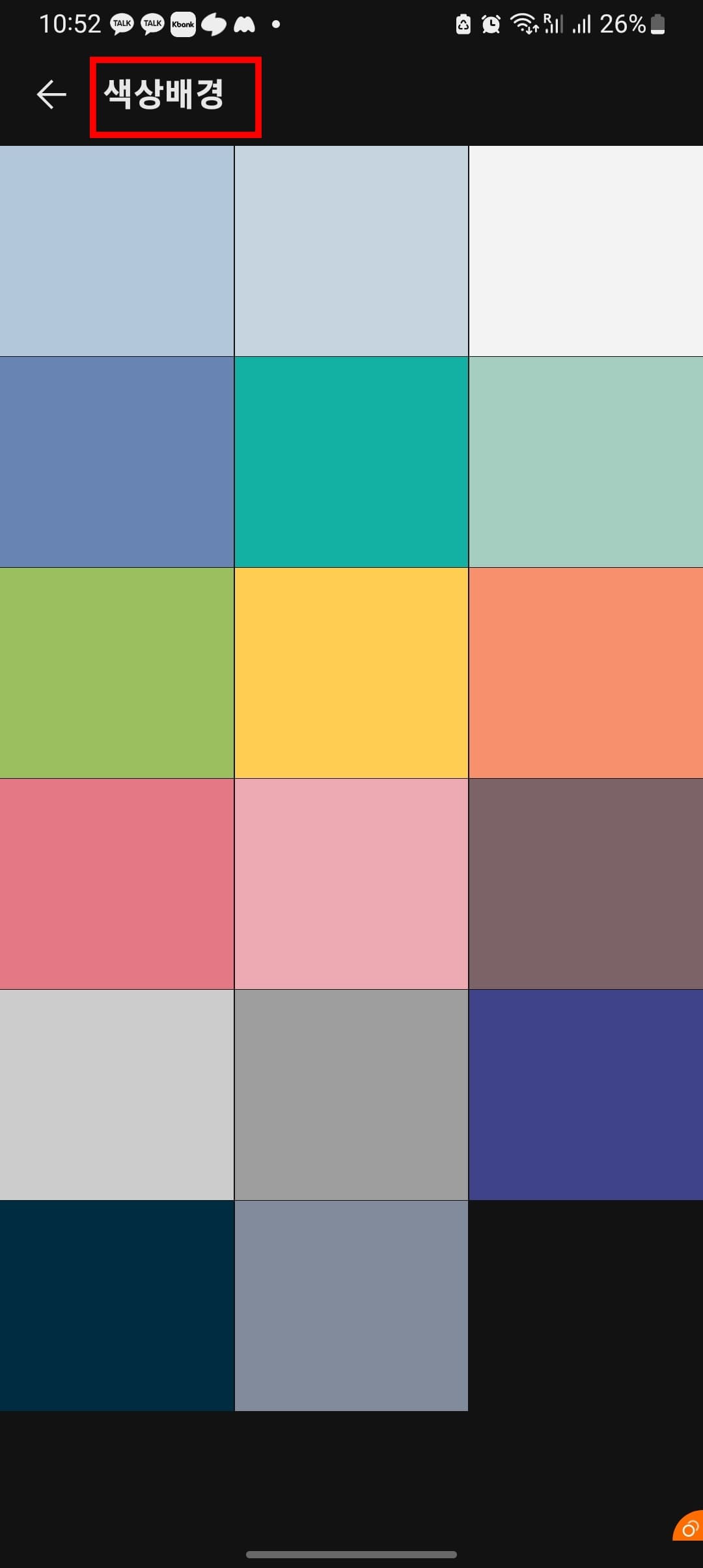 화면 메뉴 내에서 배경화면을 찾아 터치합니다. 배경화면 메뉴 내 배경선택 메뉴에는 색상변경, 일러스트 배경, 앨범에서 사진 선택 3가지 기능을 지원하고 있습니다.