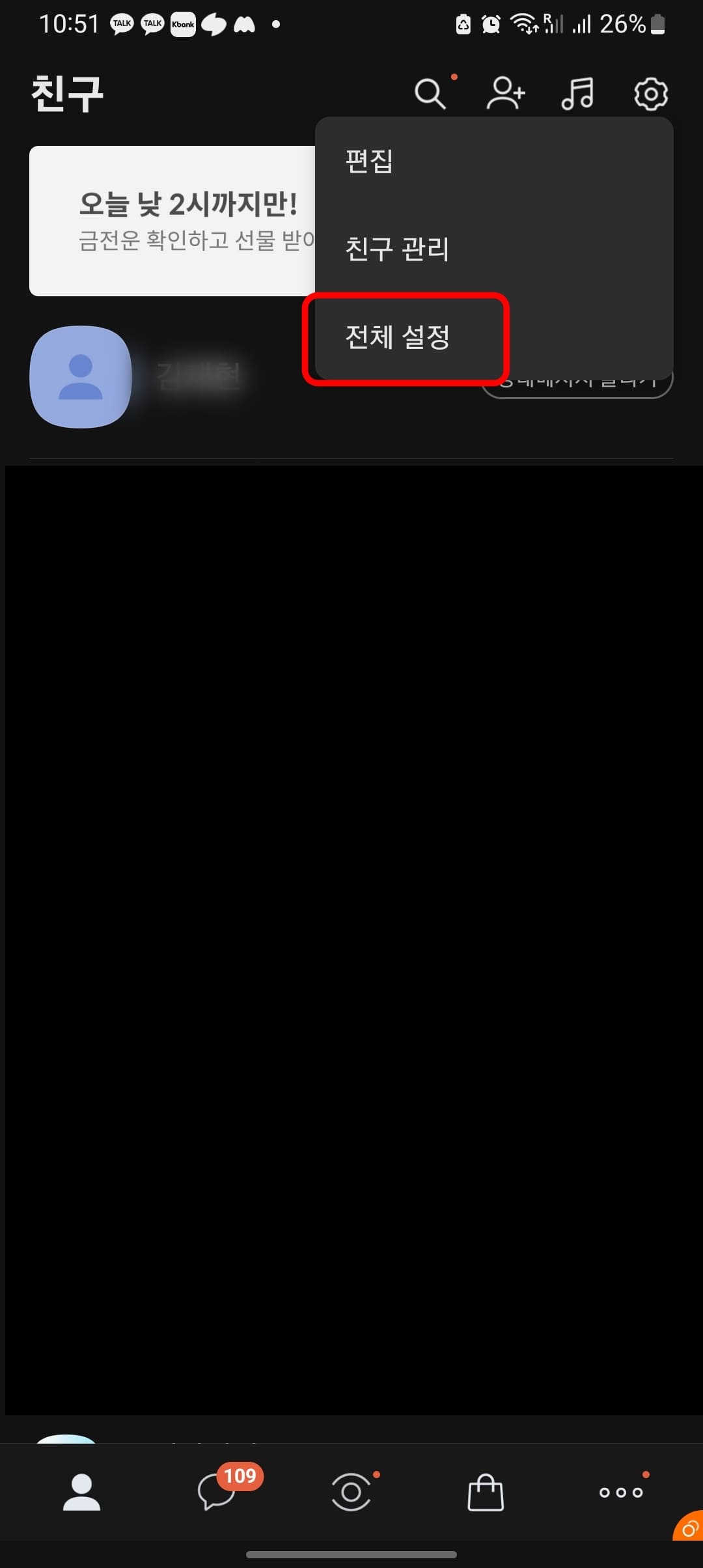 카톡을 실행하시고 홈 화면에서 우측 상단 톱니바퀴 아이콘을 터치한 후 전체설정을 터치합니다. 설정 메뉴에서 ‘화면’ 메뉴를 찾아 터치합니다.