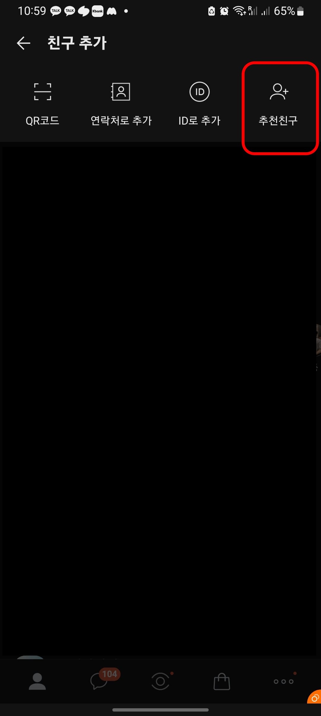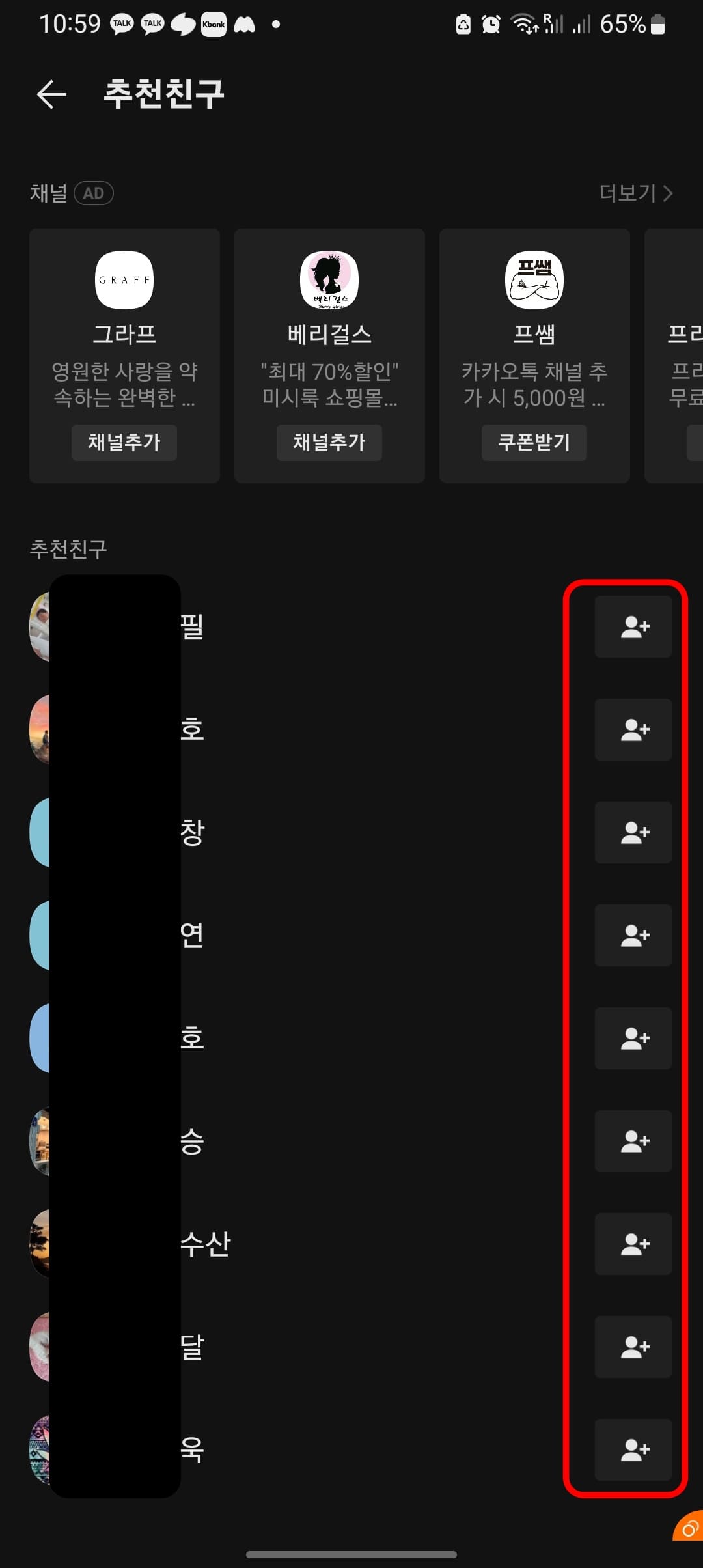 마지막으로 추천친구 추가방법입니다. 추천친구는 자신이 알 수도 있거나 과거 카톡친구였지만 전화번호 변경등으로 인해 친구가 아닌 사용자들이 표시됩니다. 우측 친구추가 버튼을 터치하여 추가할 수 있습니다.