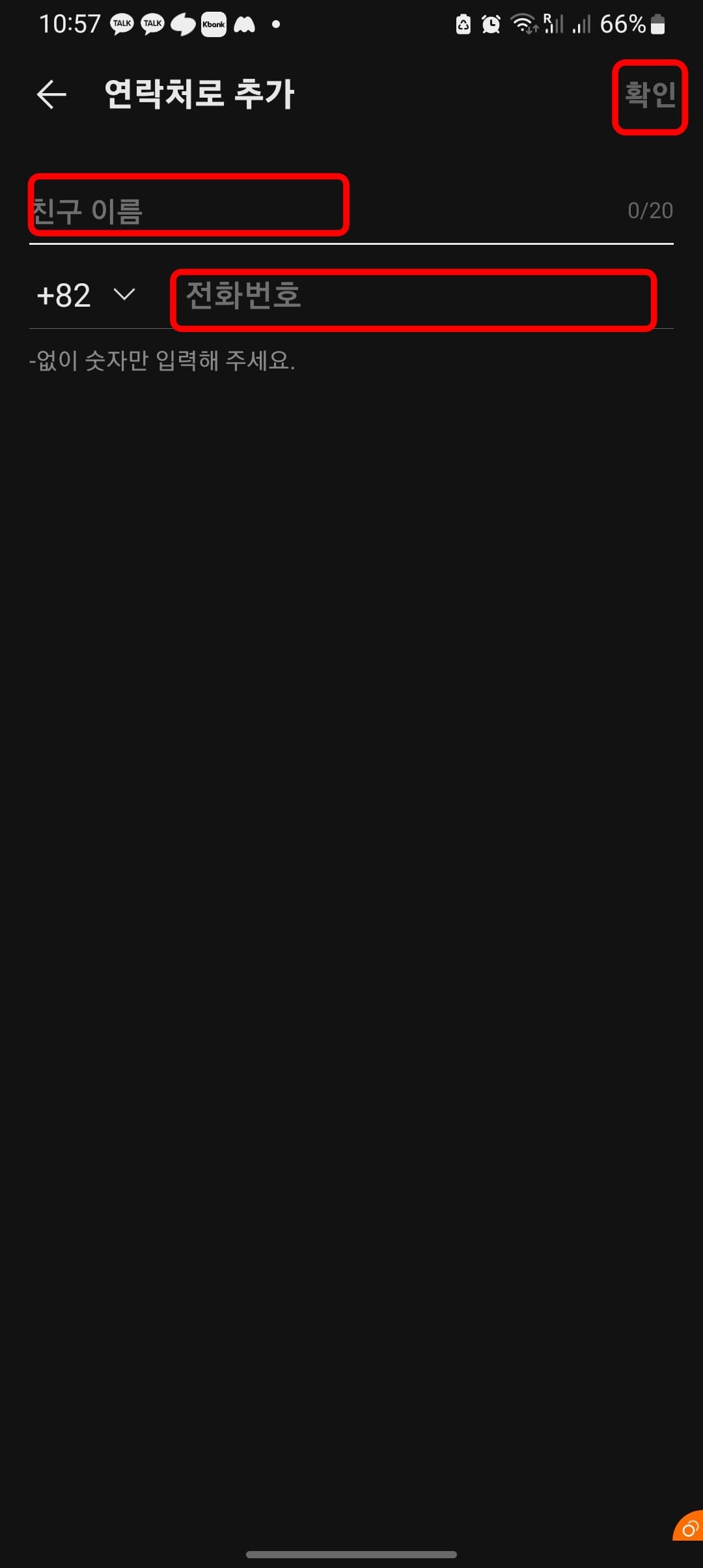 연락처로 추가 메뉴가 표시되면 카톡에서 알아볼 수 있는 친구의 이름 또는 별명과 전화번호를 입력하시고 우측 상단의 확인 버튼을 터치하면 추가가 완료됩니다.