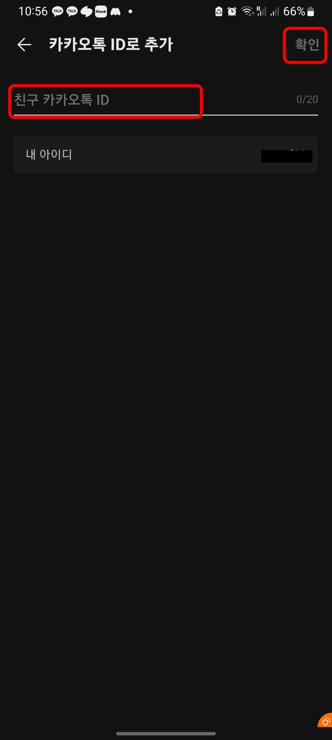 카카오톡 ID로 추가 메뉴가 표시되면 친구의 카카오톡 ID를 입력하고 우측 상단에서 확인을 터치합니다. 자신의 아이디는 카톡 프로필 메뉴에서 확인할 수 있습니다.