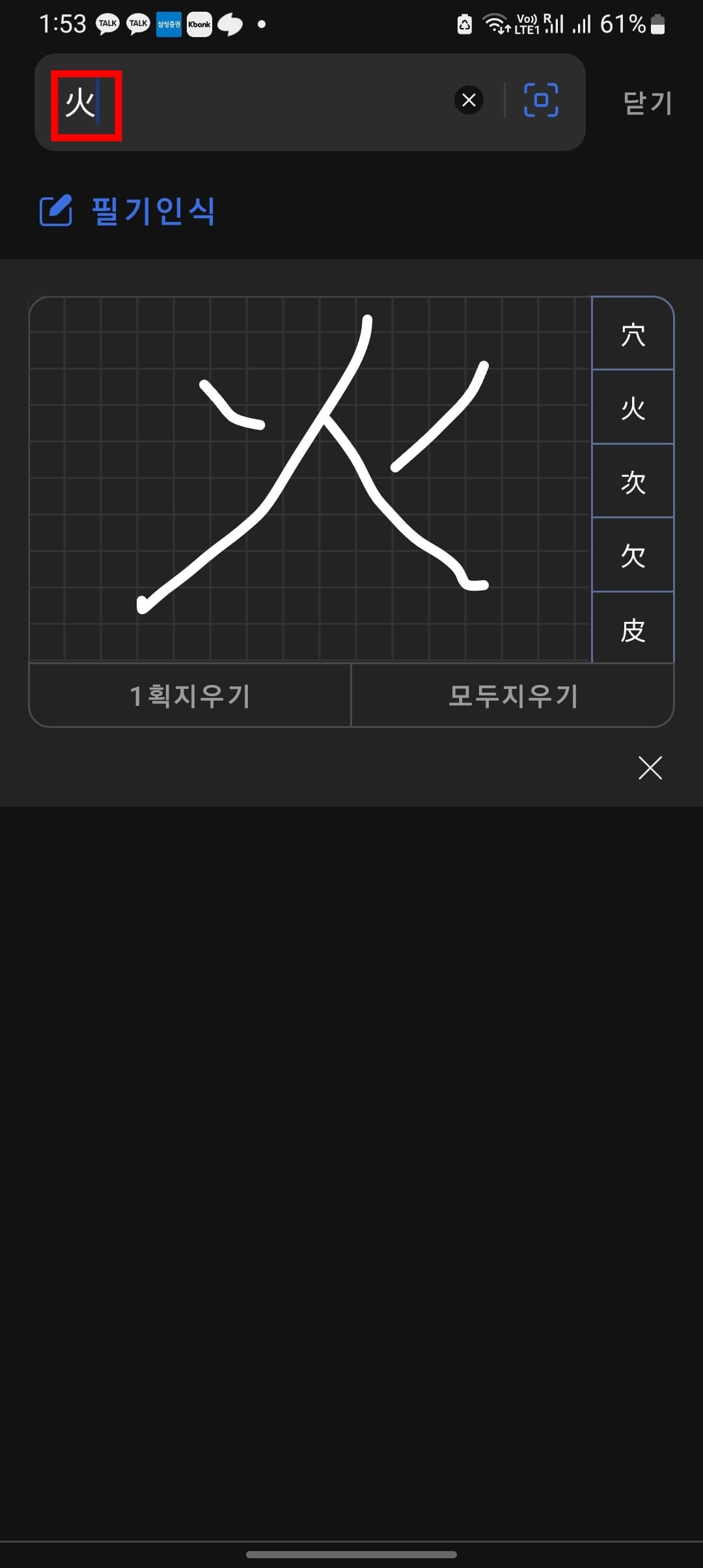 한자사전으로 변경되었으면 입력창 우측의 아이콘을 터치합니다. 필기인식 입력창이 표시되면 손가락을 사용하여 검색할 한자를 그려줍니다. 다 그리면 유사한 한자가 우측에 표시됩니다. 검색할 한자를 터치하면 검색창에 자동으로 입력됩니다.