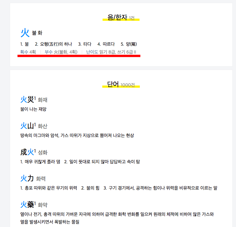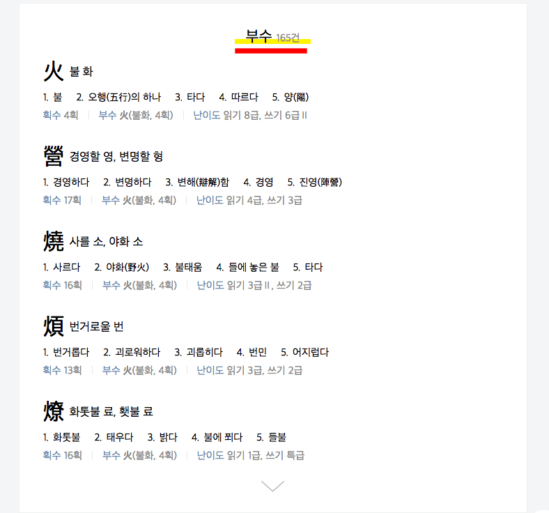 스크롤을 내리면 "불 화" 가 부수로 사용된 한자들을 찾아볼 수 있습니다.