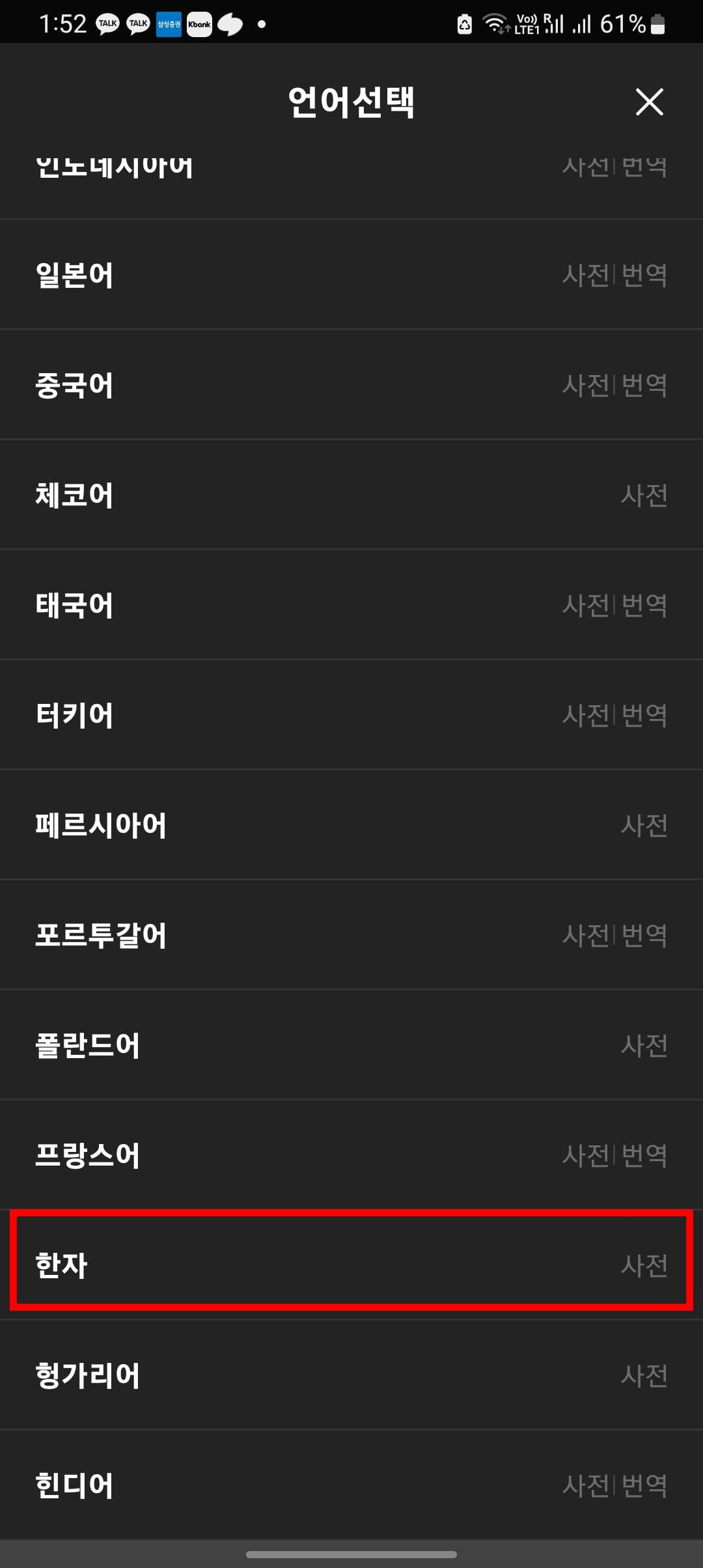 다음 사전 앱을 설치하고 실행하면 위와 같은 화면을 볼 수 있습니다. 처음에는 영어사전으로 표시되어 있으므로 영어사전을 터치합니다. 다양한 언어가 표시되면 하단에서 한자를 선택합니다.