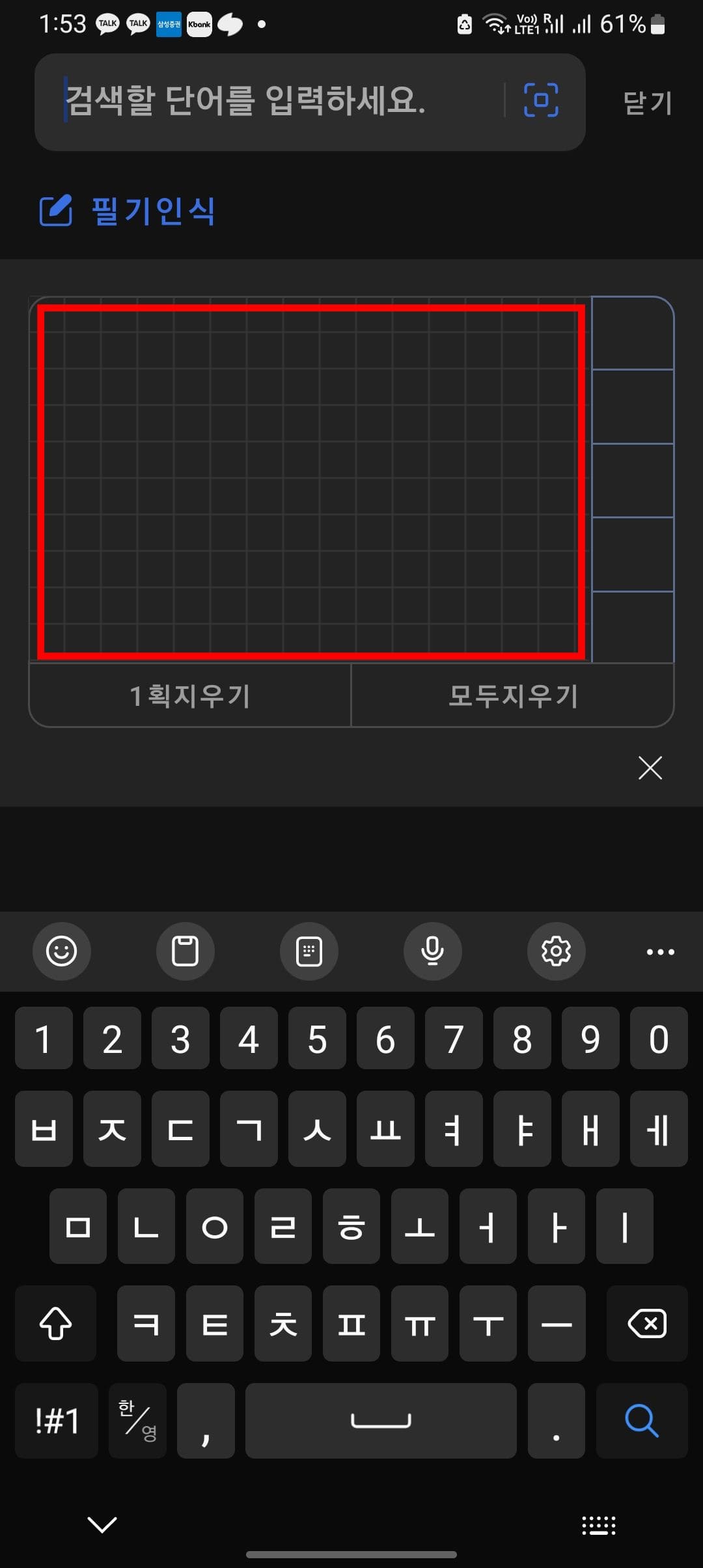 한자사전으로 변경되었으면 입력창 우측의 아이콘을 터치합니다. 필기인식 입력창이 표시되면 손가락을 사용하여 검색할 한자를 그려줍니다. 다 그리면 유사한 한자가 우측에 표시됩니다. 검색할 한자를 터치하면 검색창에 자동으로 입력됩니다.