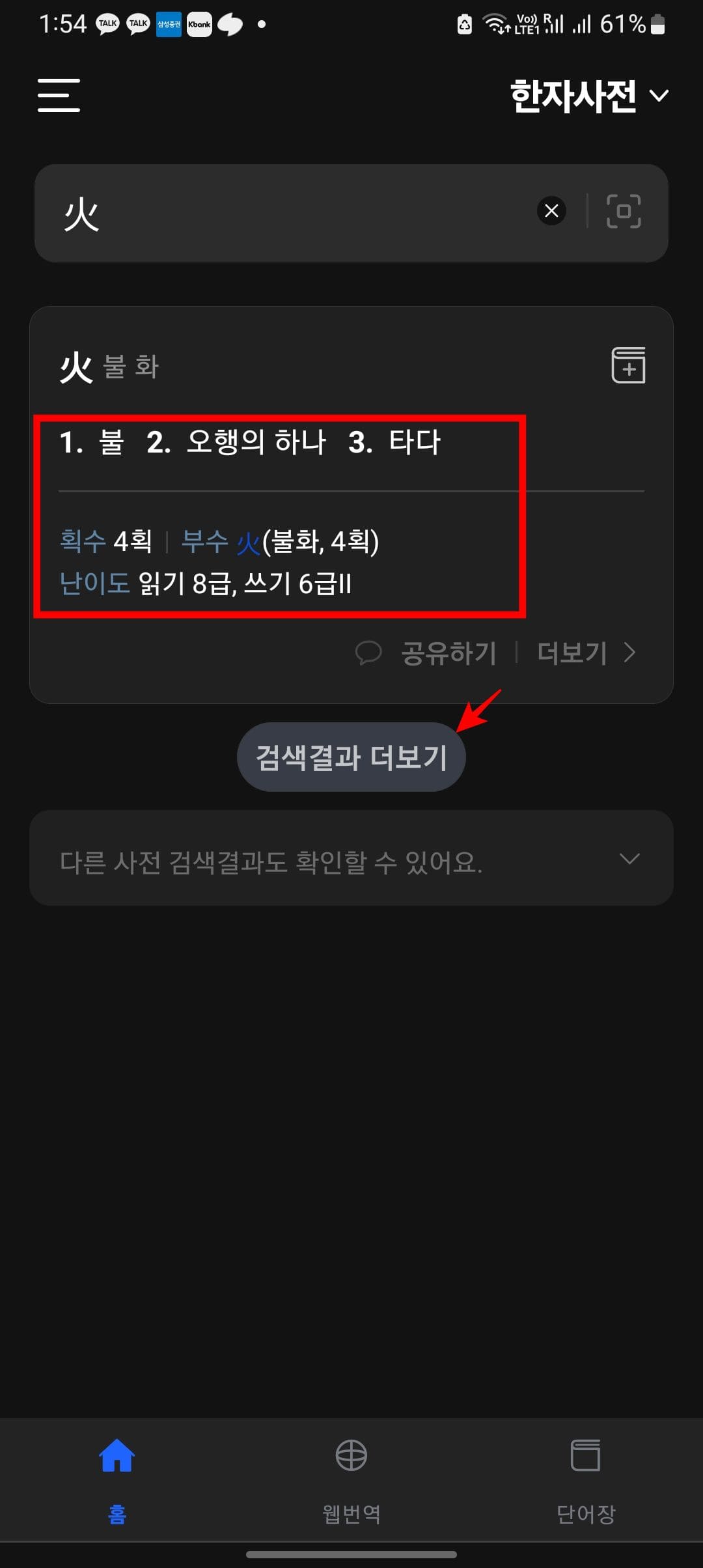 이후 완료 키를 터치하면 해당 한자에 대한 뜻과 획수 등이 표시됩니다. 검색결과 더 보기를 터치해 보시기 바랍니다. PC에서와 마찬가지로 해당 한자가 사용된 단어와 숙어들을 찾아볼 수 있습니다. 스크롤을 내리면 부수로 포함된 한자들도 찾아볼 수 있습니다.