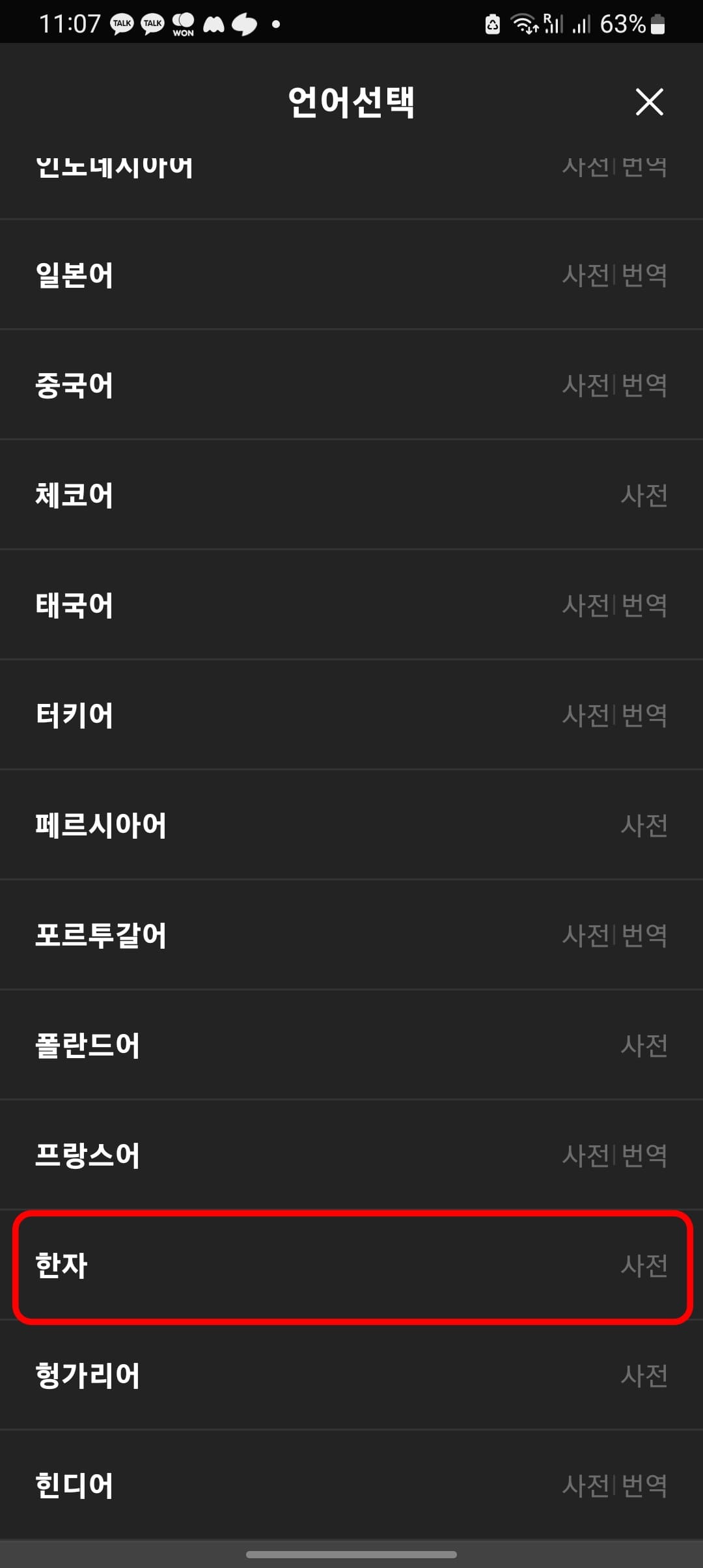 다음 사전 어플을 실행하시면 위와 같은 화면을 볼 수 있습니다. 영어사전을 클릭하면 여러 가지 언어 중 하단에서 한자를 찾아 터치합니다.