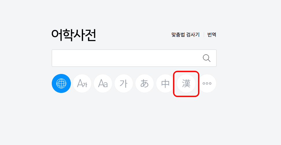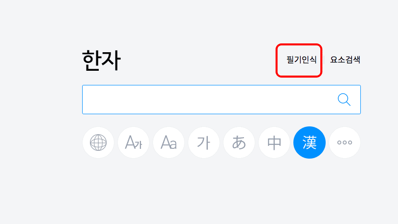 어학사전이 표시되면 검색란 하단에서 한자 아이콘을 클릭합니다. 이후 상단에서 ‘필기인식’을 클릭합니다.
