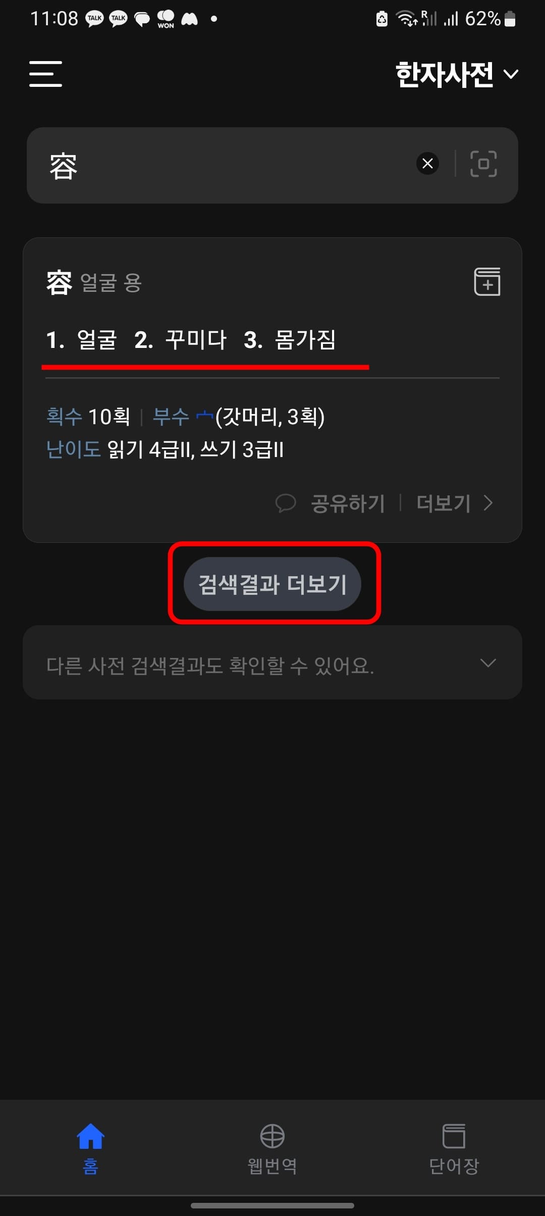 이후 얼굴 용에 대한 뜻과 획수, 부수, 난이도 등의 정보를 확인할 수 있습니다. 더 자세한 정보를 원하시면 하단의 검색결과 더 보기를 터치합니다. 해당 한자가 사용된 단어와 숙어를 살펴볼 수 있습니다.