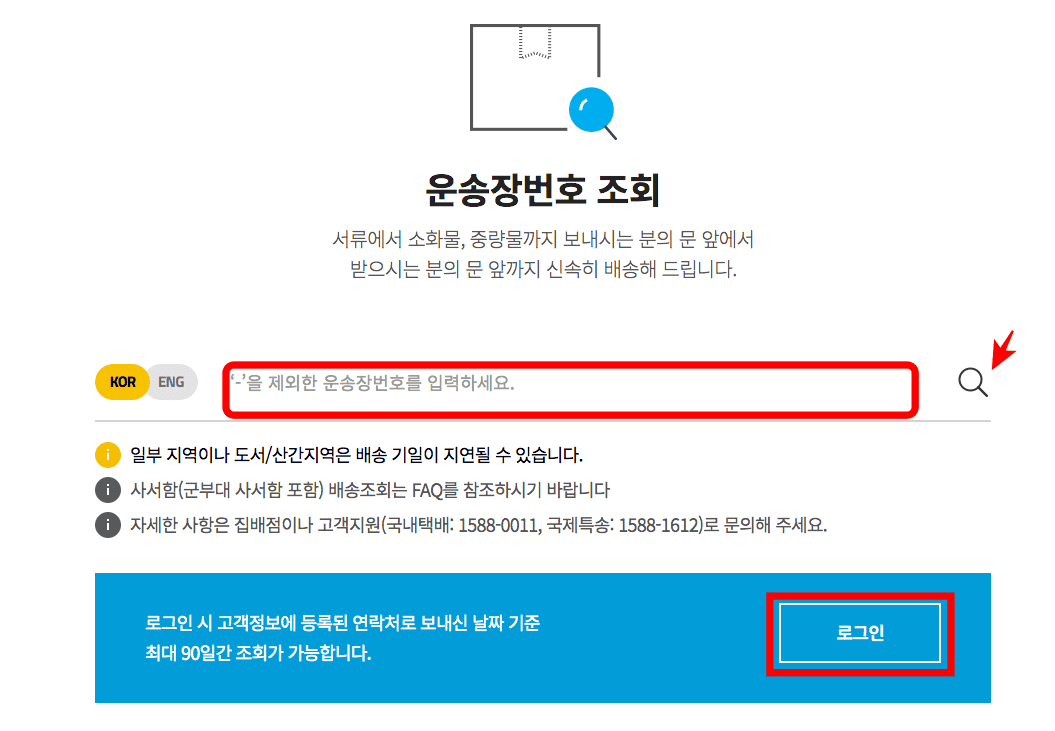 이후 운송장번호 조회 페이지가 표시되면 입력란에 운송장번호를 입력하시고 우측의 돋보기 아이콘을 클릭하여 위치를 조회합니다. 만약 회원가입 후 로그인을 하는 경우에는 최대 90일간 배송조회를 할 수 있으니 이점도 참고하시기 바랍니다.