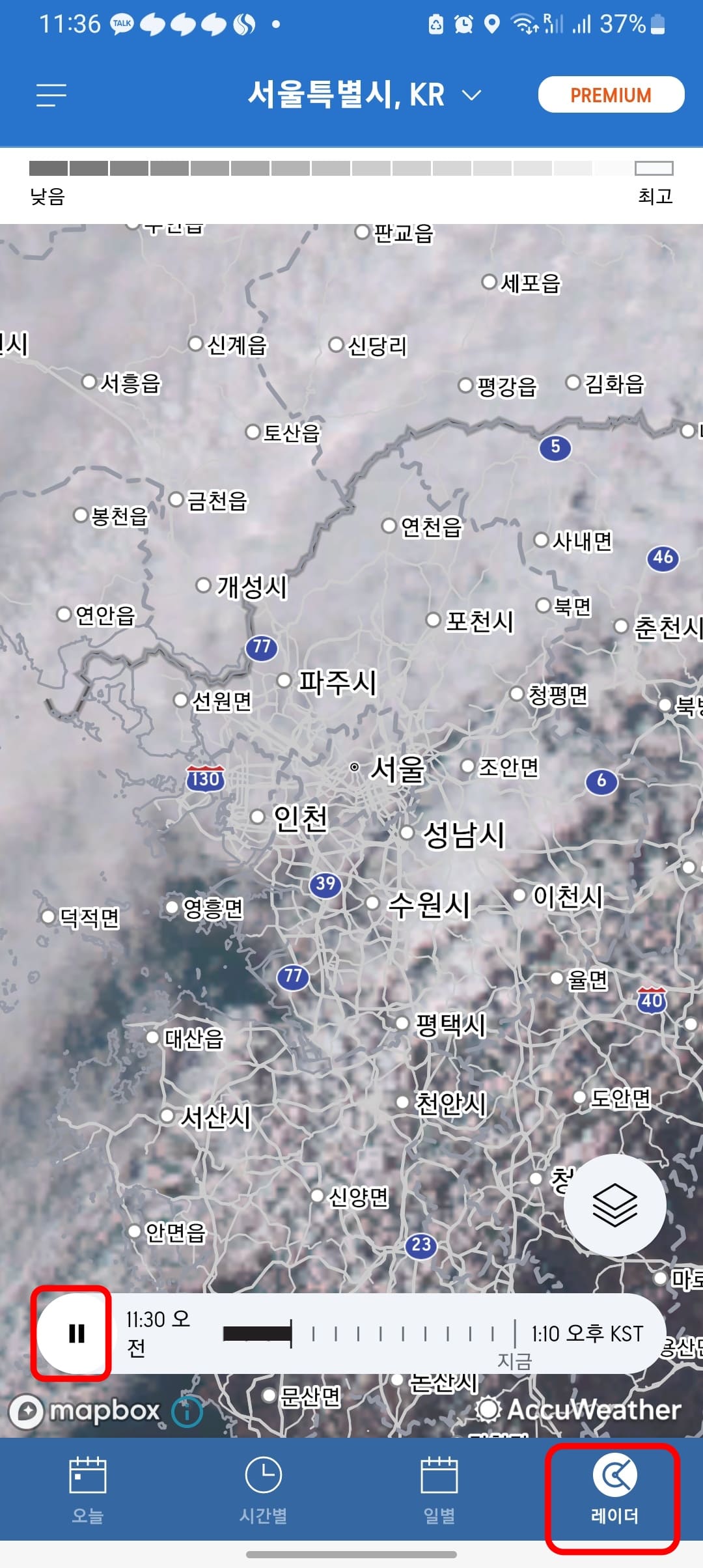 마지막으로 하단에서 레이더 메뉴를 터치합니다. 레이더는 위성사진으로 보이는 강수 확률을 확인할 수 있습니다. 재생 버튼을 터치하면 구름의 이동방향이 표시되는데요. 지역이 검은색일수록 강수확률이 낮은 것이며 하얀색일 수 록 강수확률이 높은 것입니다.