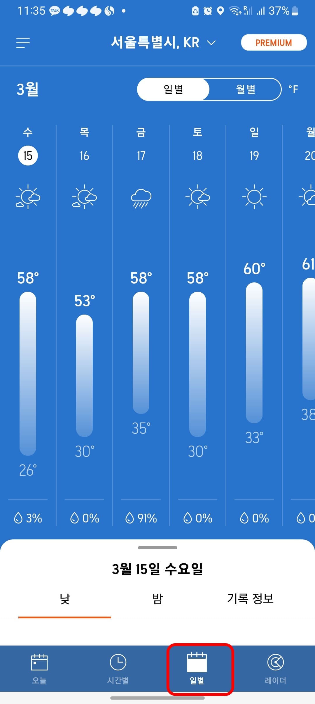 어플 하단의 시간별 메뉴를 터치합니다. 이 메뉴에서는 오늘 시간별로 강수량과 온도를 실시간으로 확인할 수 있습니다. 이번에는 일별 메뉴를 터치해 봅니다. 일별 월별 강수량과 온도를 파악할 수 있습니다.