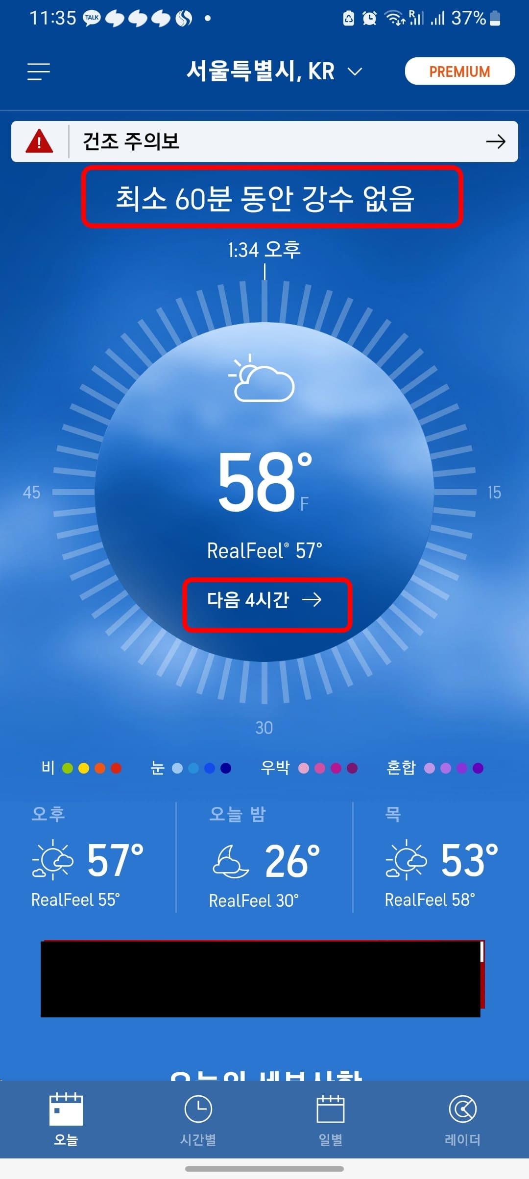 아큐웨더 어플을 실행하시면 위와 같은 화면을 볼 수 있습니다. 현재 최소 60분 동안 강수가 없었다고 표시되는데요. 화면 중앙의 다음 4시간을 터치하면 다음 4시간 동안의 강수 유무를 확인할 수 있습니다.