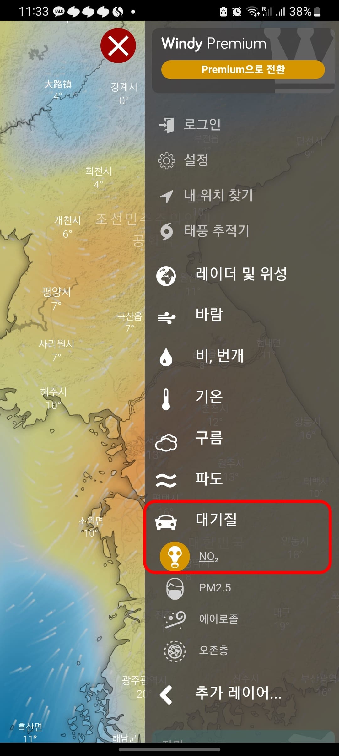 지도상에 파란색으로 표시된 부분이 비가 올 가능성이 많은 지역으로 보시면 됩니다. 이번에는 대기오염도를 측정하는 기준인 이산화질소 상황을 표시해 보겠습니다. 대기질 > NO2 메뉴를 선택합니다.