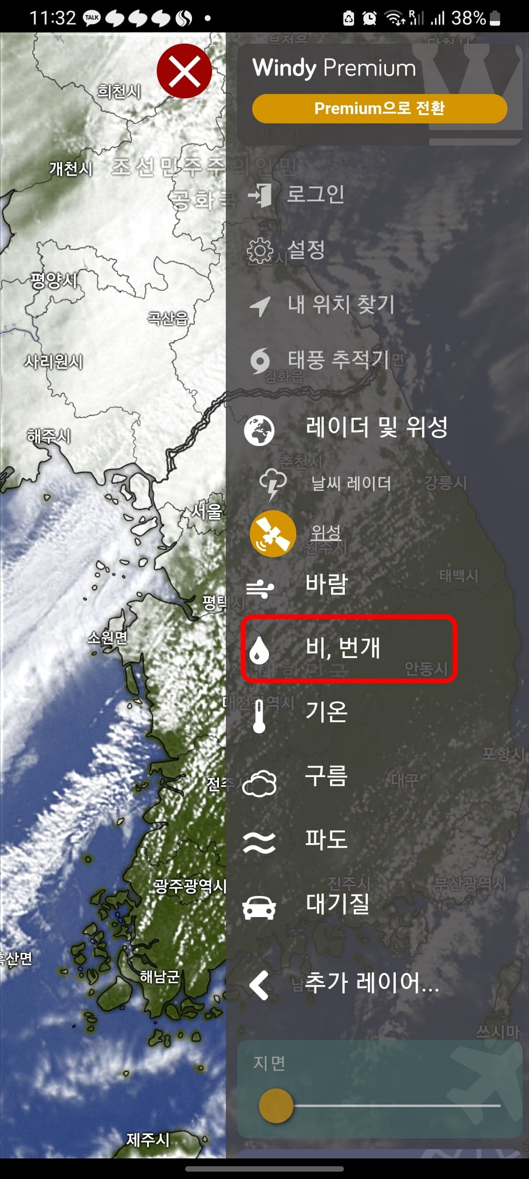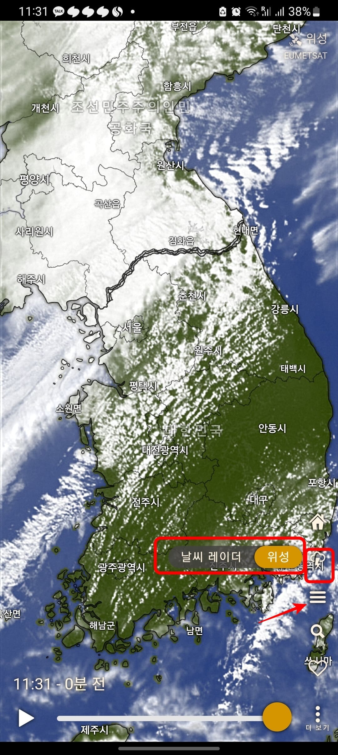 이번에는 위성사진을 통해 구름의 위치를 확인해 보겠습니다. 우측 하단 메뉴에서 번개 아이콘을 터치하여 위성을 선택합니다. 현재 어느 지역에 구름이 많이 형성되어 있는지 실시간 위성을 통해 확인이 가능합니다. 이번에는 우측 하단의 3선 아이콘을 터치합니다.