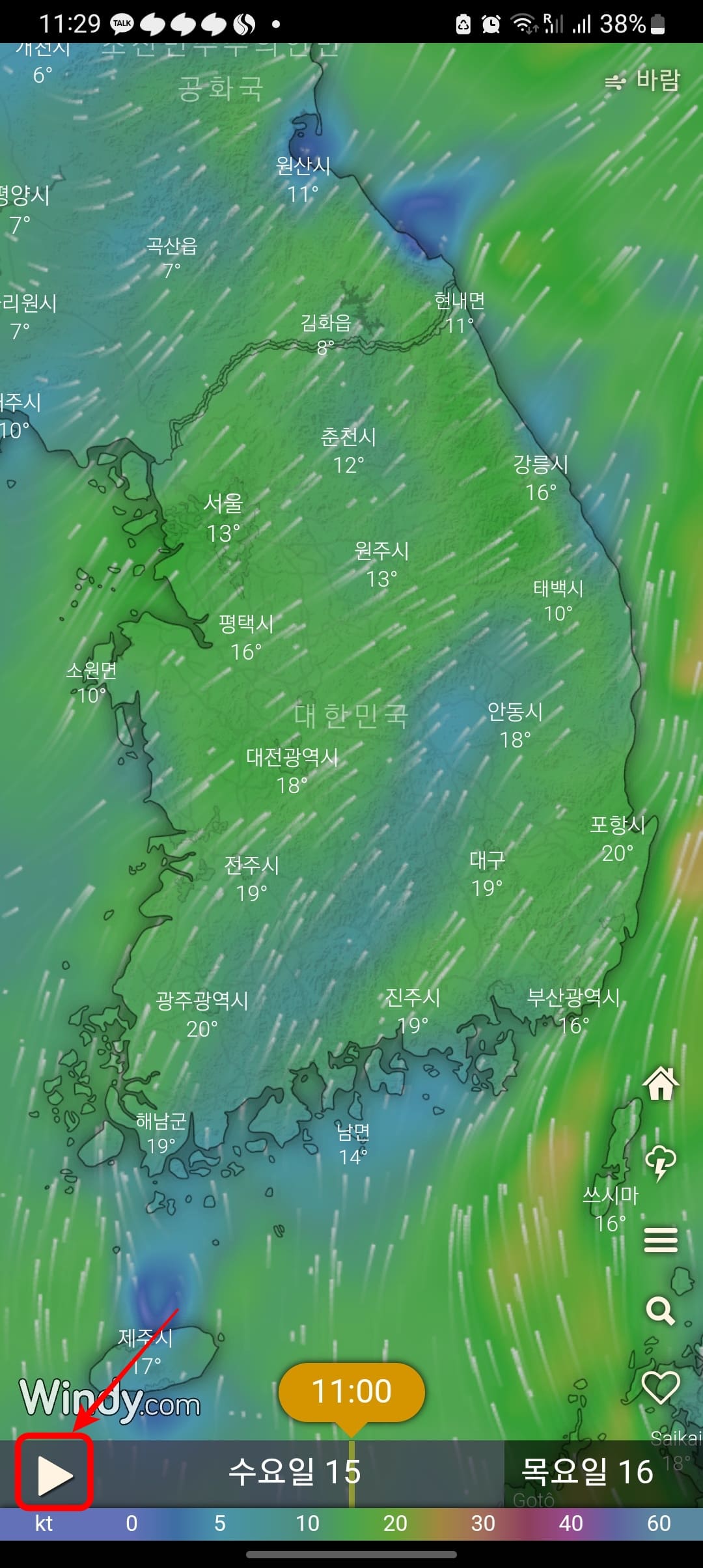 어플을 실행하시면 현재 위치의 지도를 확인할 수 있습니다. 아래 표시된 재생버튼을 터치하면 시간별 바람의 이동 방향이 실시간으로 보입니다. 재생이 되는 동안 화면을 이동시키거나 확대해도 바람의 이동방향이 자세히 표시됩니다.