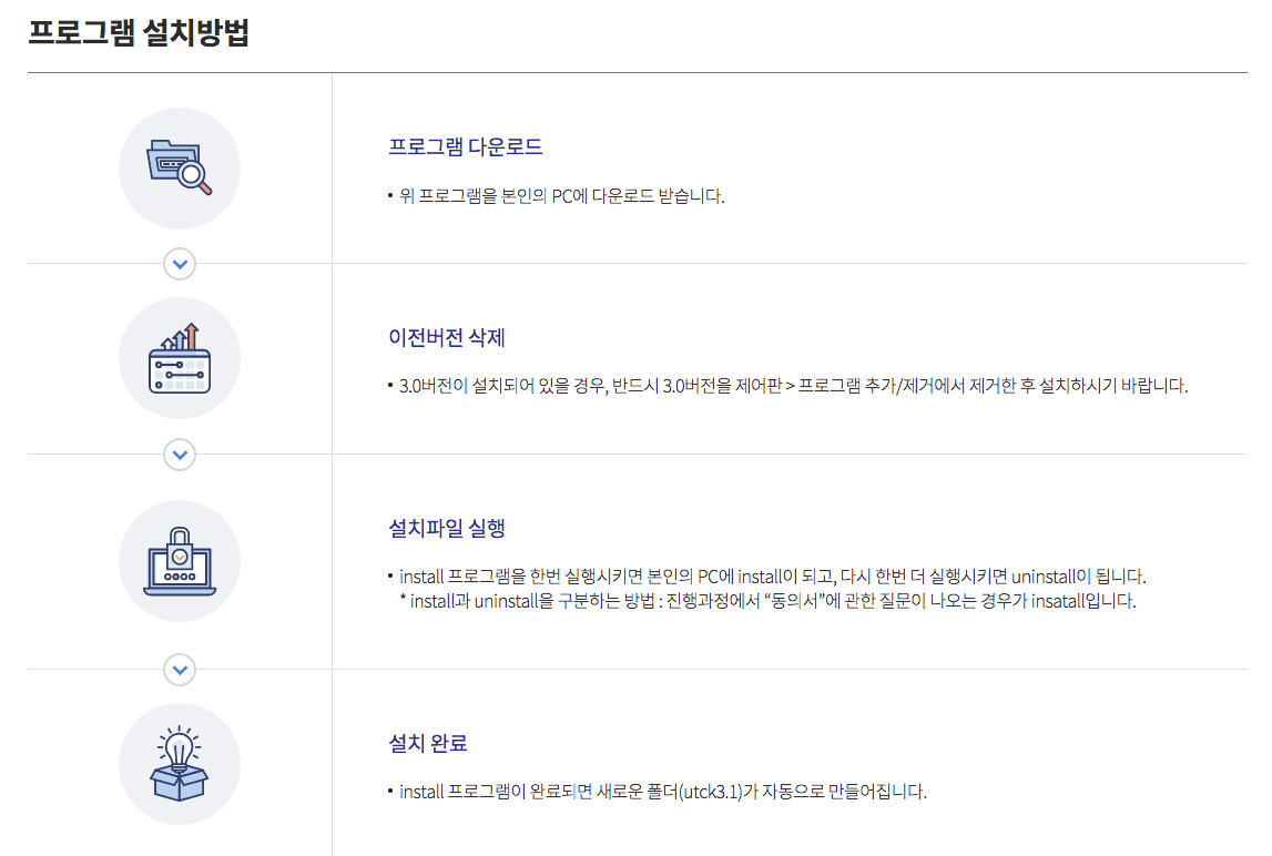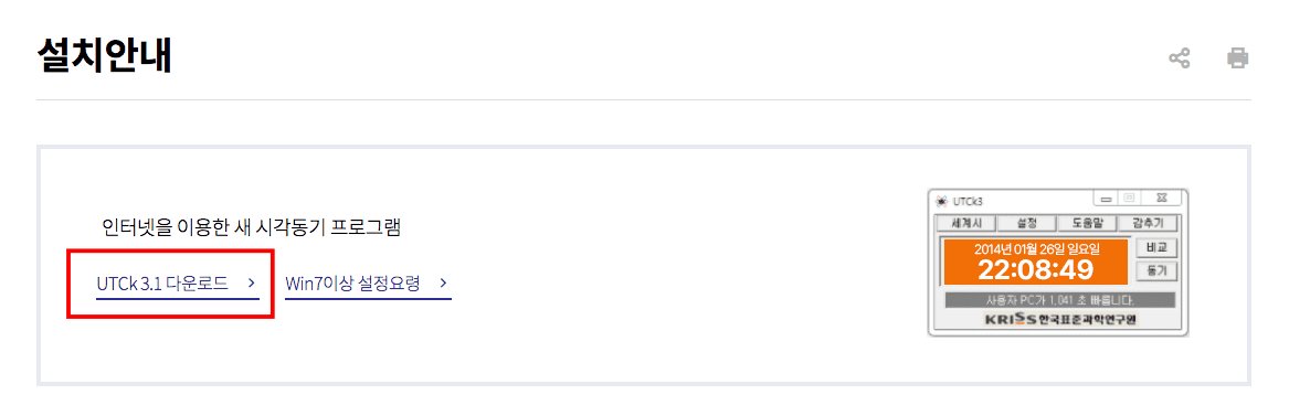 설치안내 하단의 UTCk3.1 다운로드를 클릭하여 설치파일을 저장합니다. 프로그램 파일을 실행하면 설치가 시작되고 설치 완료 후 바로 사용이 가능합니다.