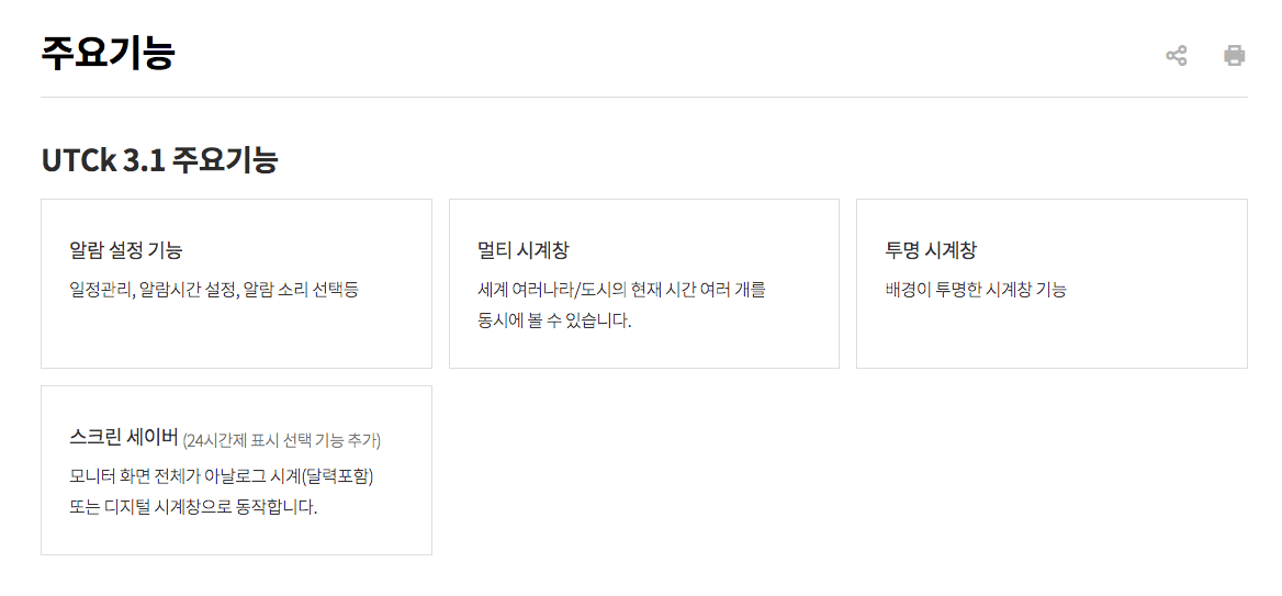 해당 프로그램의 주요 기능은 일정관리, 알람 설정, 멀티 시계창을 지원하여 세계의 여러나라와 도시의 시간대를 초단위로 동시에 확인할 수 있습니다. 또한 모니터 화면 전체가 아날로그시계 또는 디지털시계창으로 동작하는 스크린 세이버 기능도 이용 가능하니 직접 확인해 보시기 바랍니다.