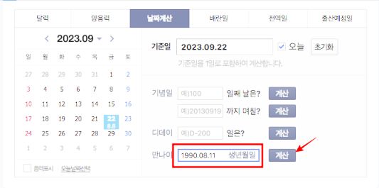 해당 페이지에 방문하시면 위와 같은 화면을 볼 수 있습니다. 기준일이 오늘도 되어 있다면 하단의 만 나이 입력란에 자신의 생년월일을 입력합니다. 이후 우측의 계산 버튼을 클릭하면 결과를 쉽게 확인할 수 있습니다.