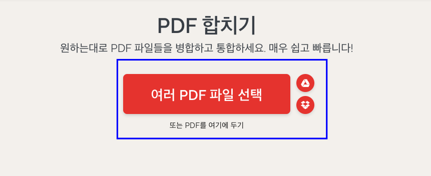 메인 페이지에 방문하시면 위의 사진처럼 PDF 합치기 메뉴를 클릭합니다. 이후 화면에 하나 이상의 PDF 파일을 화면에 끌어다 놓거나 파일선택 버튼을 클릭합니다.