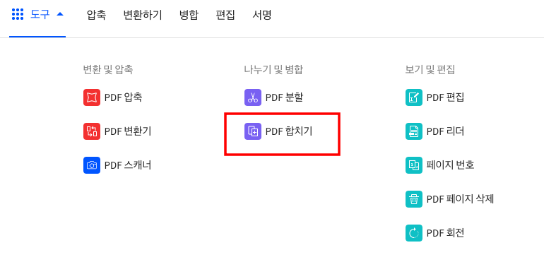 웹사이트에 방문하시면 상단에서 도구 메뉴를 클릭합니다. 도구 > 나누기 및 병합 메뉴에서 PDF 합치기를 선택합니다.
