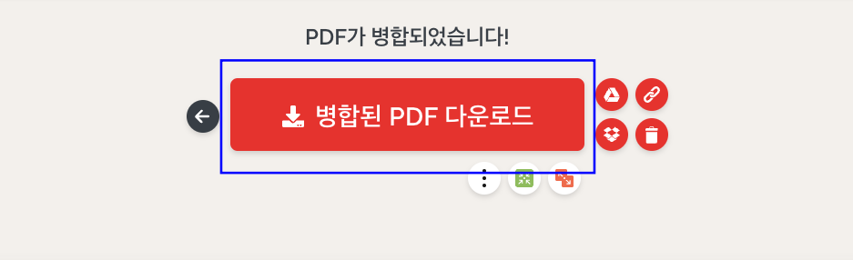 파일 합치기가 완료되면 ‘병합된 PDF 다운로드’ 버튼을 클릭하여 파일을 PC에 저장합니다.