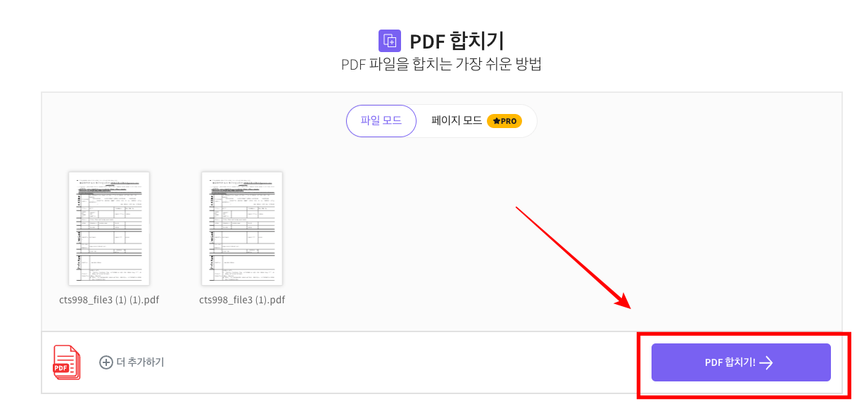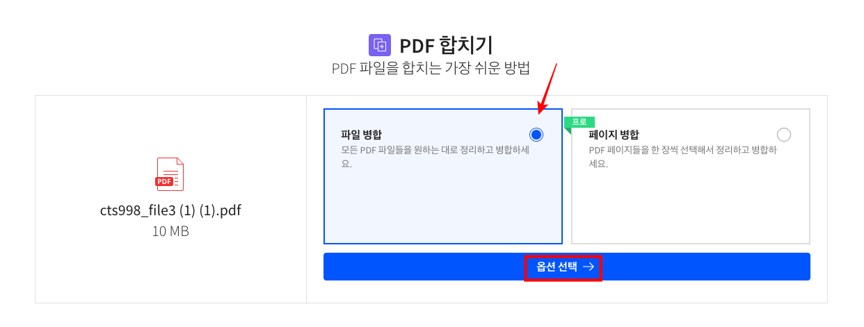 파일 병합 옵션을 선택하시고 하단에서 옵션 선택을 클릭합니다. 선택된 PDF 문서들이 화면에 표시되면 PDF 파일을 추가하거나 우측 하단에서 PDF 합치기 버튼을 클릭합니다.