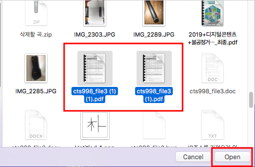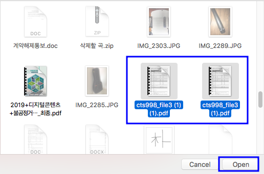 컴퓨터 내의 PDF 파일을 선택하고 하단에서 Open 버튼을 클릭합니다. 병합할 PDF 파일이 좌측에 표시되며 우측 하단에서 PDF 합치기 버튼을 클릭하면 병합이 시작됩니다.