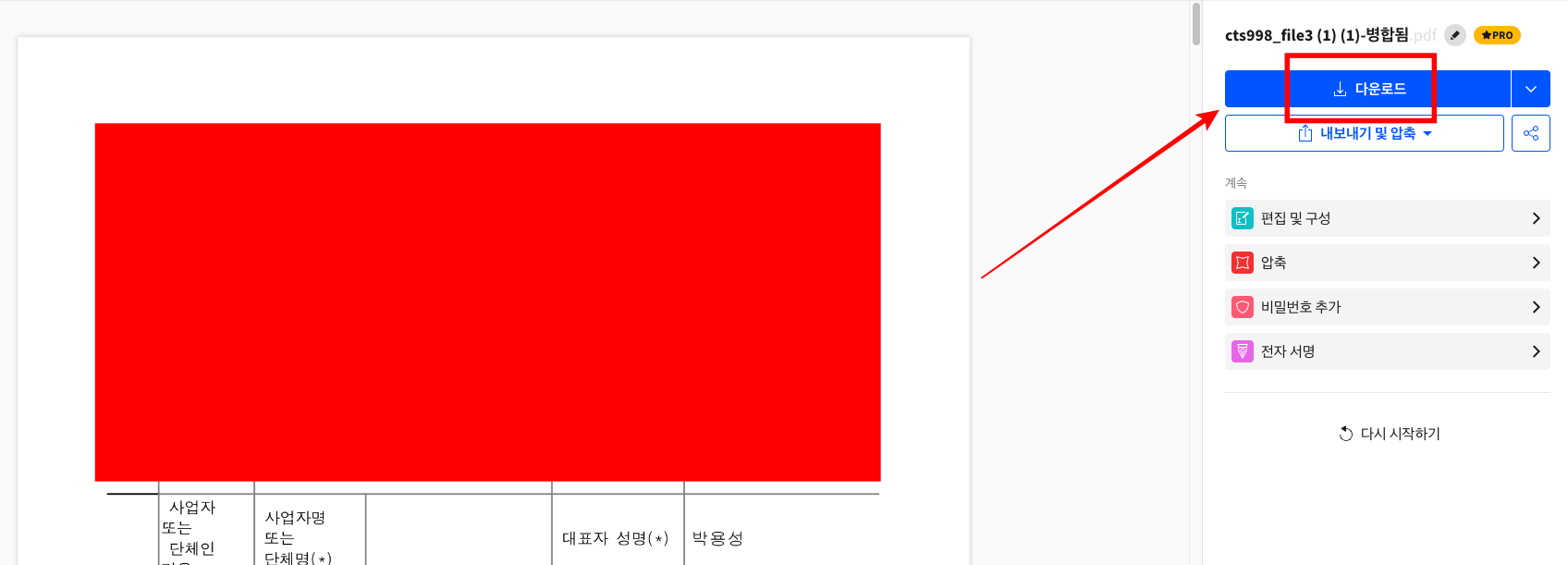 PDF가 병합되면 문서의 미리 보기 화면이 좌측에 표시됩니다. 문서 내용을 확인하시고 우측의 다운로드 버튼을 클릭하면 컴퓨터로 파일이 저장됩니다.
