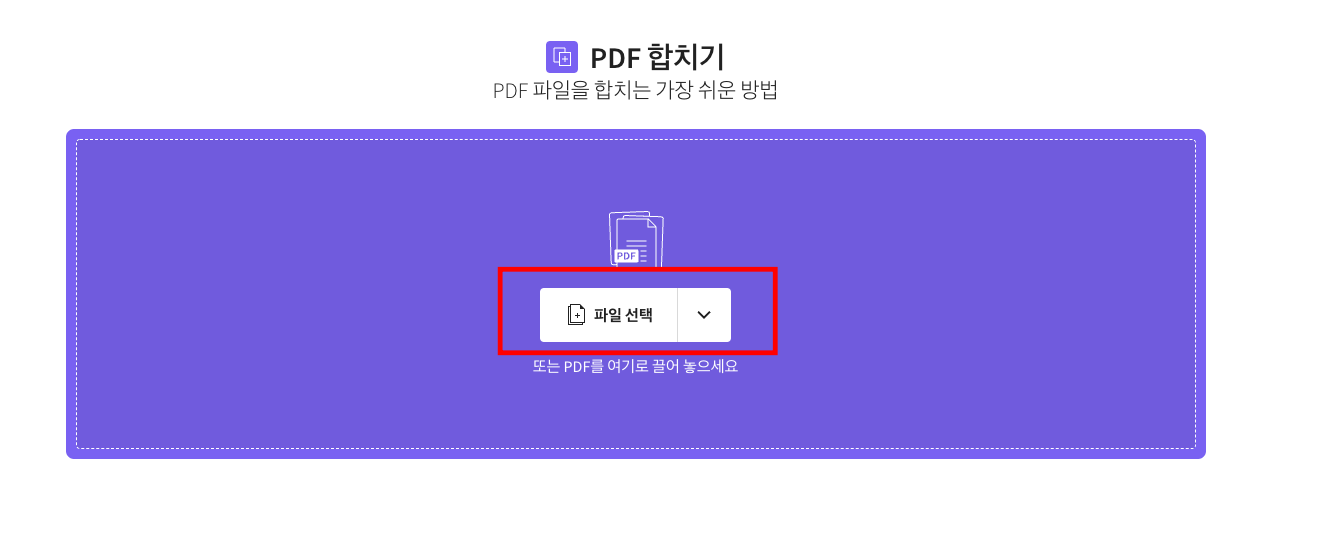 PDF 합치기 화면이 표시되면 하나이상의 PDF 파일을 보라색 박스 안으로 끌어 놓거나 파일 선택 버튼을 클릭합니다. 병합할 PDF 파일을 컴퓨터 하드드라이브에서 선택하고 하단에서 open 버튼을 클릭합니다.