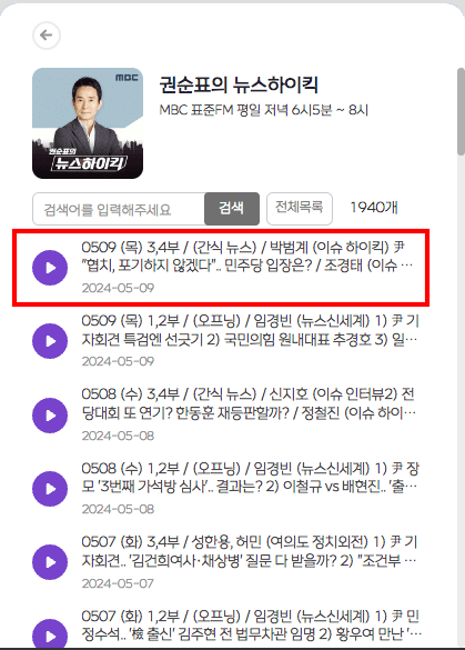 팟캐스트에서는 방송 중이거나 종영된 프로그램 청취가 가능합니다. 프로그램 목록이 표시되면 스크롤을 내려 원하는 프로그램을 찾아봅니다. 요즘 화제가 되고 있는 [권순표의 뉴스 하이킥]을 선택해 보았습니다. 팟캐스트 프로그램은 지난 방송 또한 청취가 가능합니다. 원하는 회차를 선택합니다.