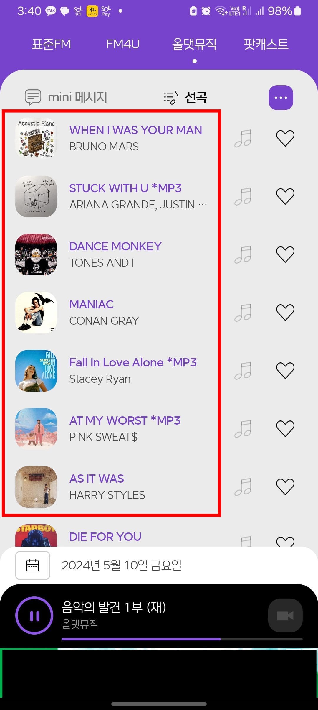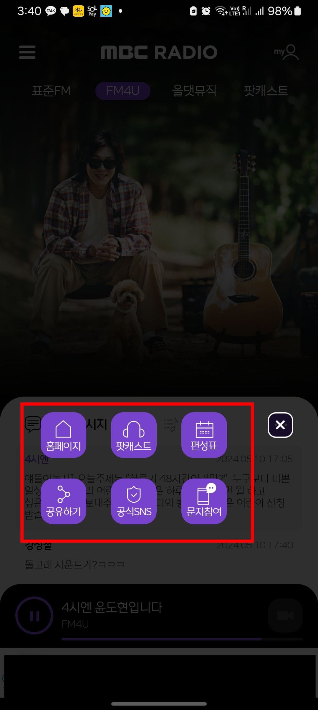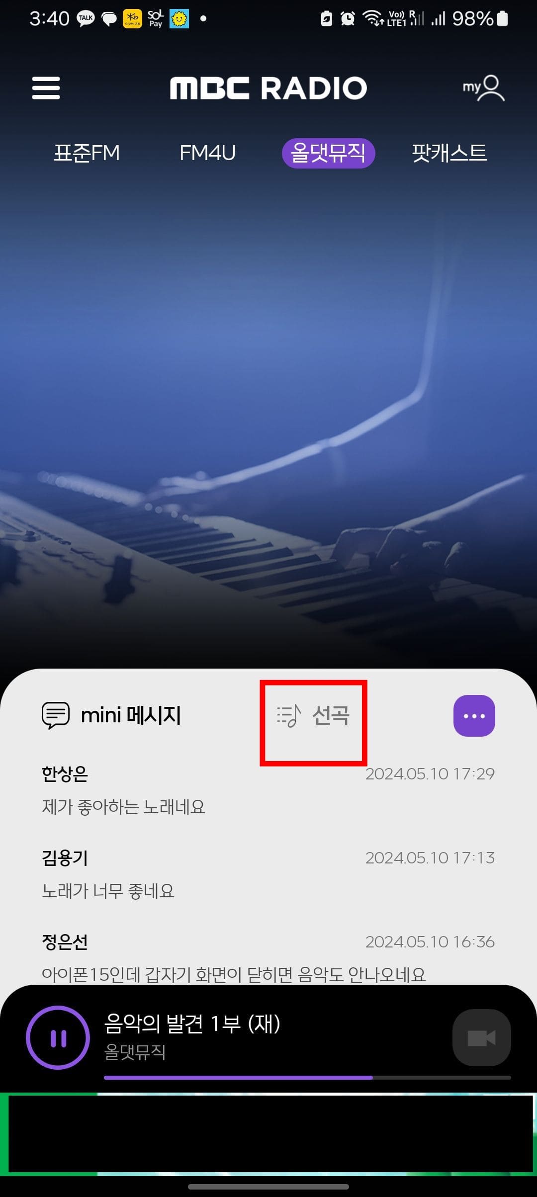 미니 메시지 우측을 살펴보시면 점 3개 아이콘을 있습니다. 이 아이콘을 클릭하면 편성표를 확인하거나 문자참여도 가능하니 확인해 보시기 바랍니다. 또한 [선곡] 메뉴를 제공합니다. 음악을 주로 재생하는 방송에서 듣기 좋은 음악을 발견했을 때 선곡버튼을 터치하여 목록을 살펴보면 어떤 가수의 어떤 음악이 재생되었는지 확인할 수 있습니다. 이렇게 새로운 가수나 뮤지션을 알게 되어가는 재미가 있습니다.