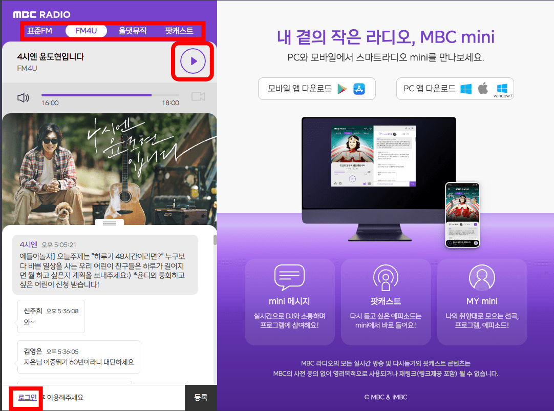 MBC 스마트 라디오 페이지에 방문하시면 위와 같은 화면을 볼 수 있습니다. 상단 메뉴 하단에서 채널 선택이 가능하며 제목 우측의 재생 버튼을 클릭하면 mbc 라디오 실시간듣기가 가능합니다. 만약 라디오에 댓글을 남기고 싶으면 좌측 하단의 로그인 버튼을 클릭하여 로그인을 해야 참여가 가능합니다.