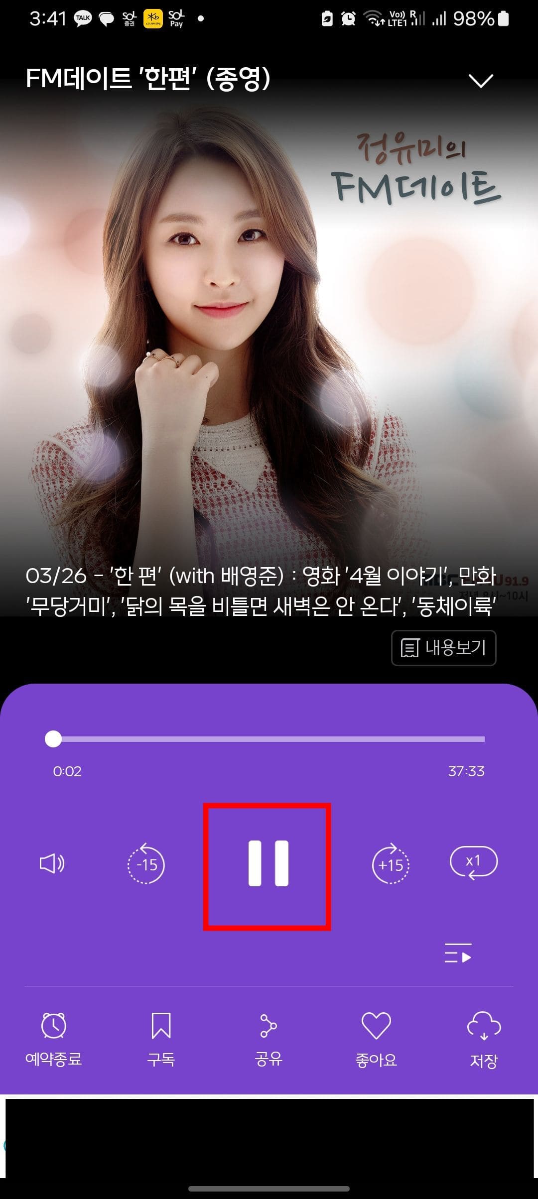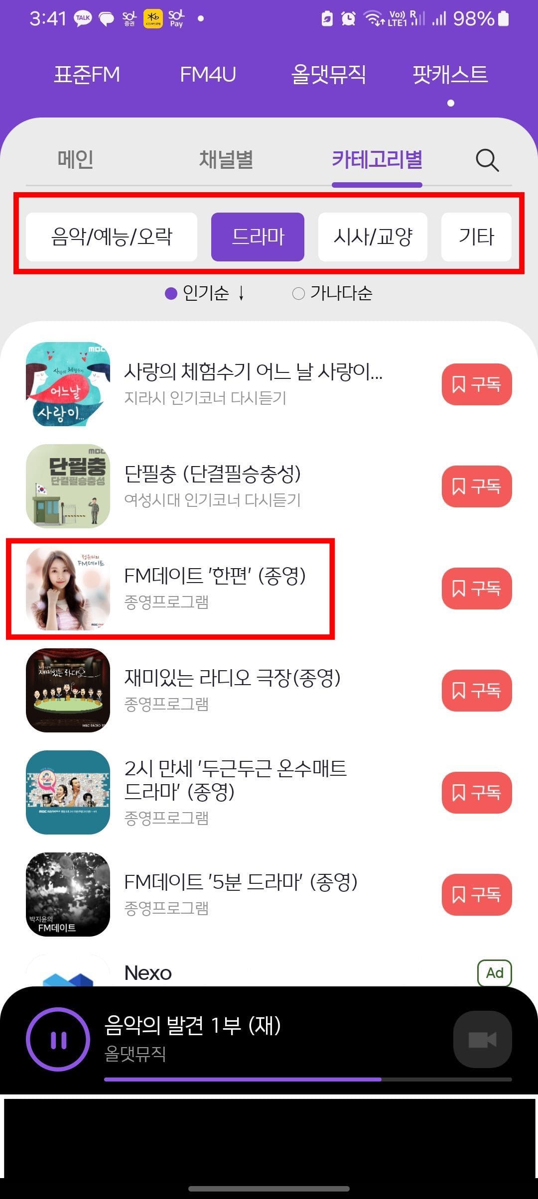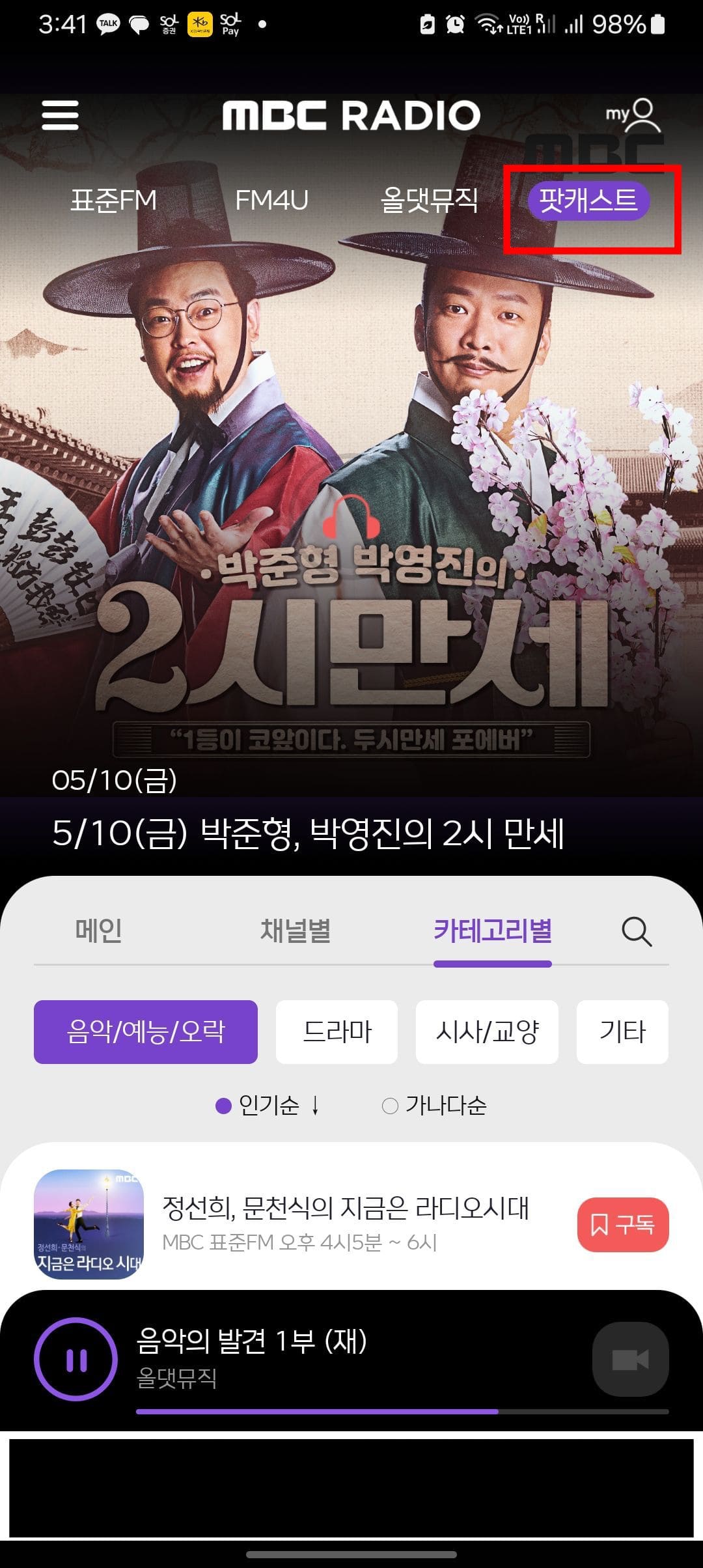 PC와 마찬가지로 팟캐스트 메뉴에서는 음악, 예능, 오락, 드라마, 시사, 교양 등에 대한 다양한 방송을 찾아볼 수 있습니다. 이미 종영된 프로그램도 찾아서 정주행 할 수 있습니다. 원하는 방송을 찾았다면 터치합니다. 이후 원하는 회차의 재생 버튼을 터치하면 큰 화면에서 재생이 가능합니다.