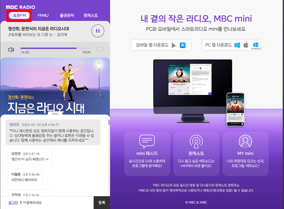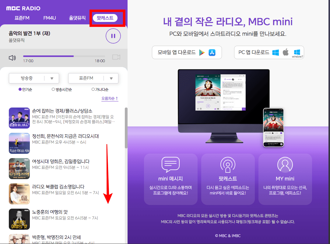 모바일에서 mbc 라디오를 청취하시려면 아래 링크를 통해 mbc 미니 앱을 설치해야 합니다. 아래 링크를 통해 설치해 보시기 바랍니다.